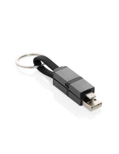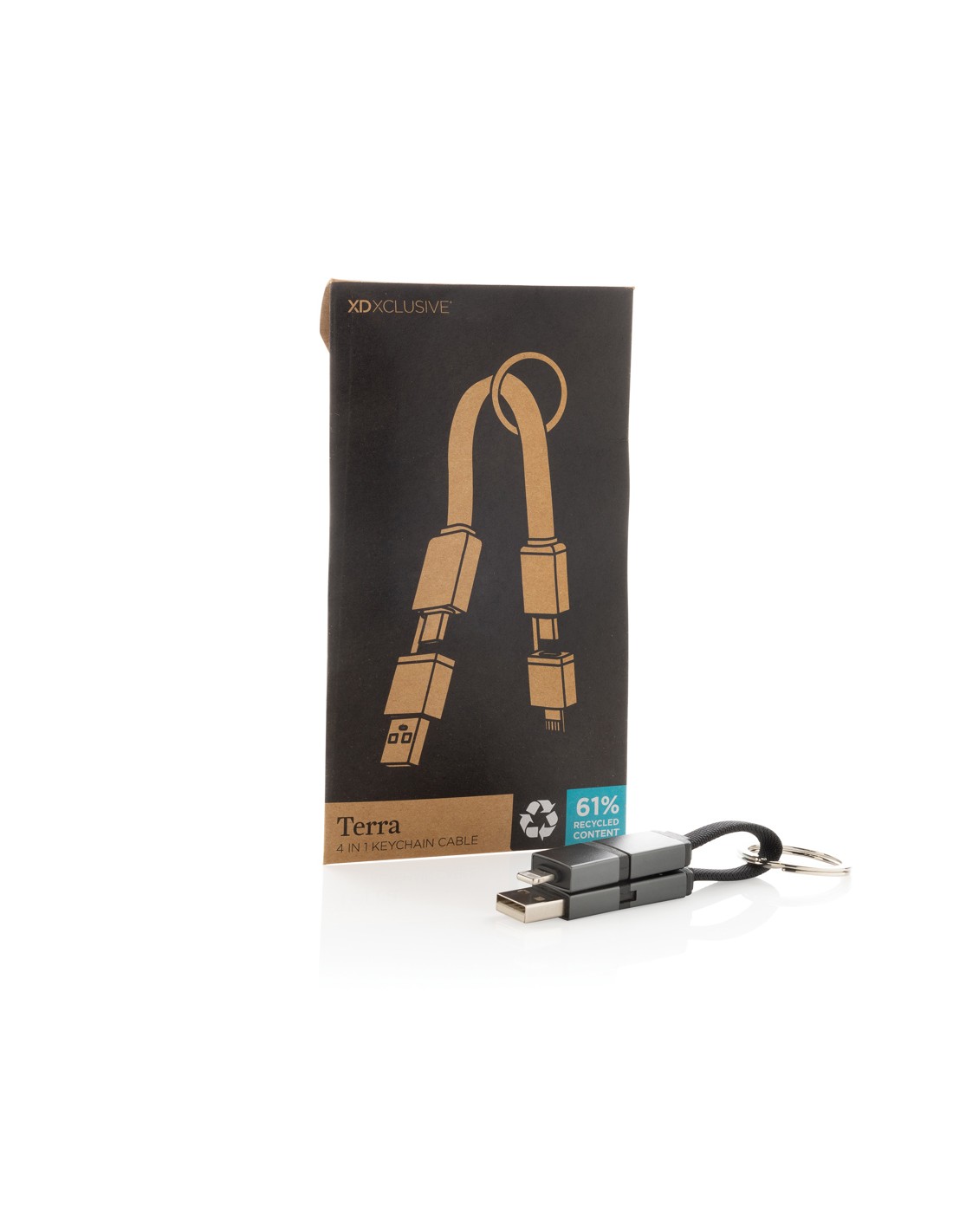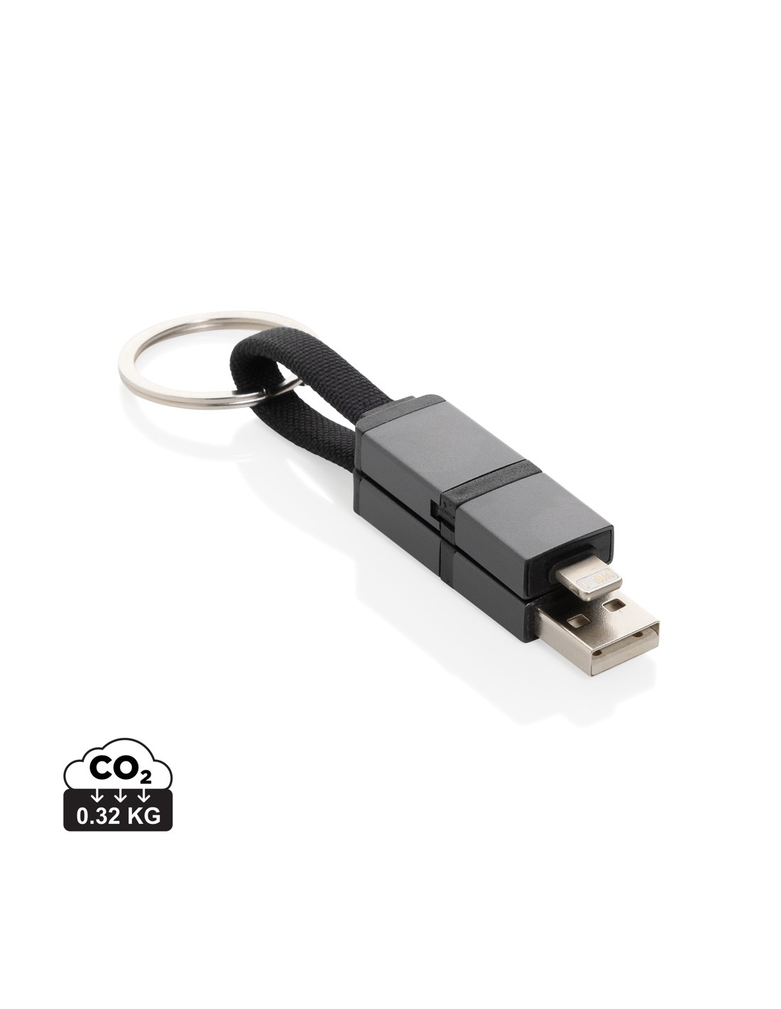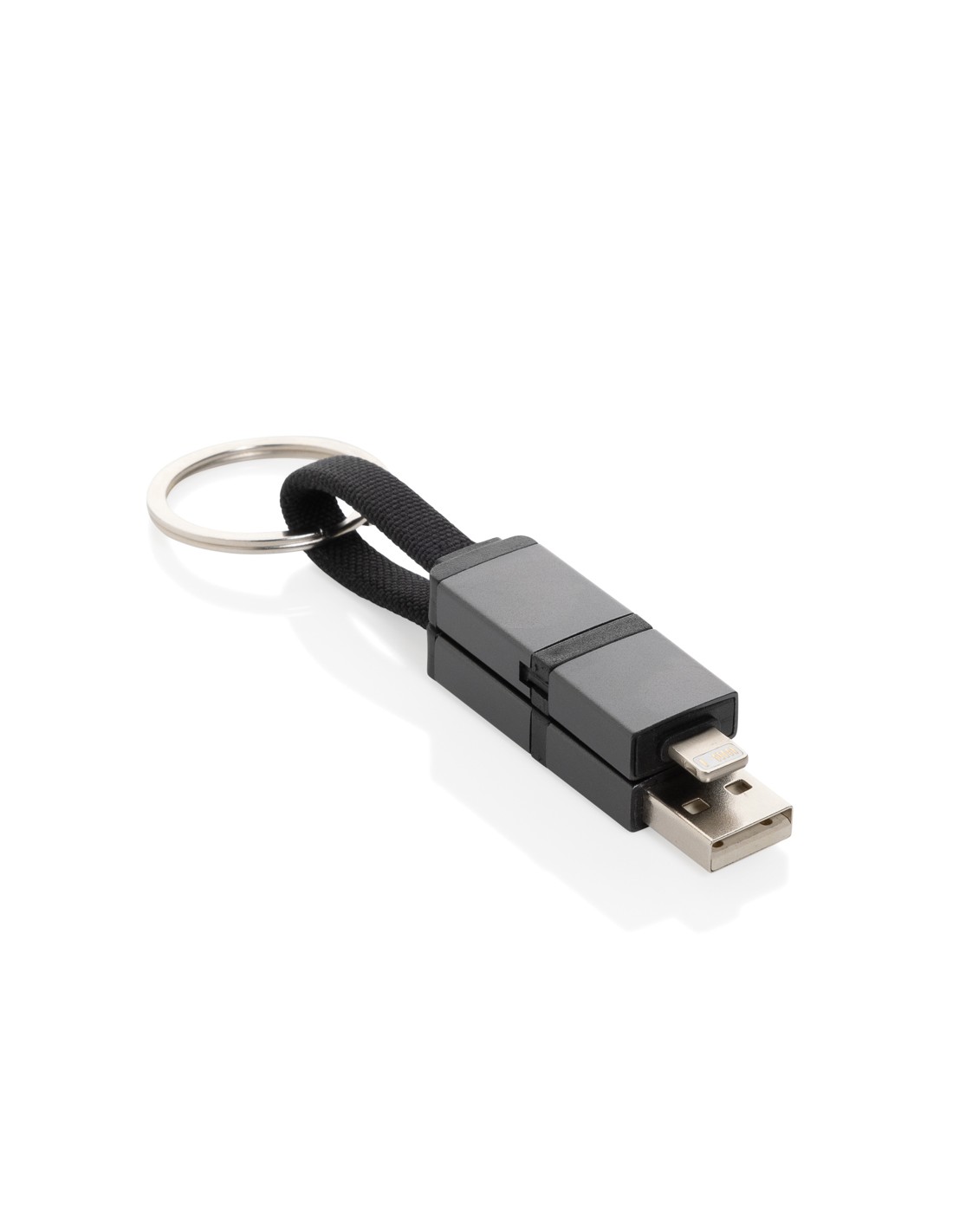 Cavo portachiavi 4in1 a ricarica rapida realizzato in TPE riciclato RCS, lega di alluminio riciclato e PET riciclato. Input USB A e type C e output iOS e type C, è adatto a ricaricare diversi dispositivi. Questo cavo di piccole dimensioni supporta una ricarica rapida da 60W. Facile da attaccare al portachiavi grazie all'anello incorporato. I connettori sono dotati di magneti all'interno per tenerli uniti durante il trasporto. Contenuto riciclato totale: 60% in base al peso totale dell'articolo. La certificazione RCS garantisce una catena di approvvigionamento completamente certificata dei materiali riciclati. Corrente massima supportata 20V/3A; confezionato in busta senza plastica. Senza PVC.