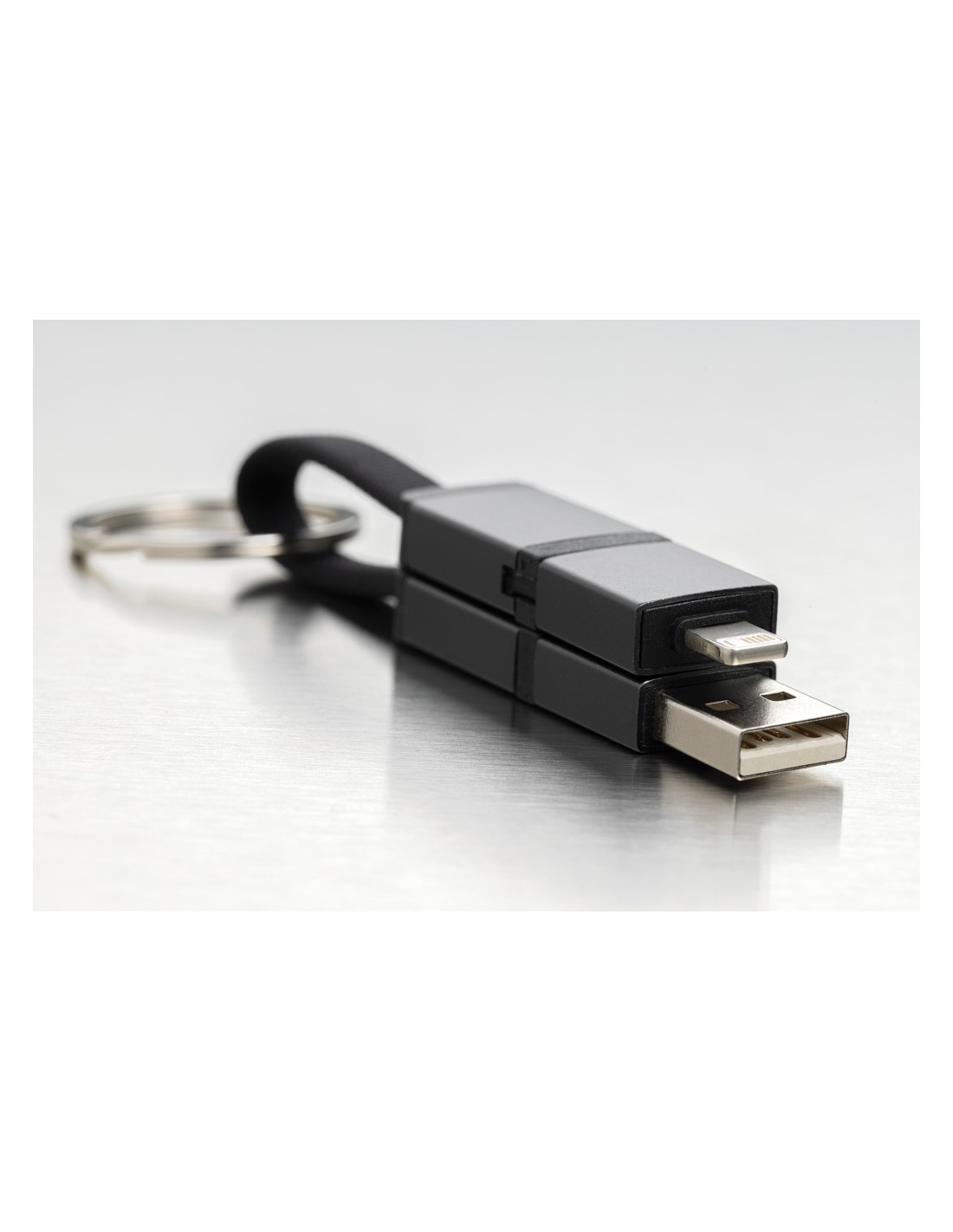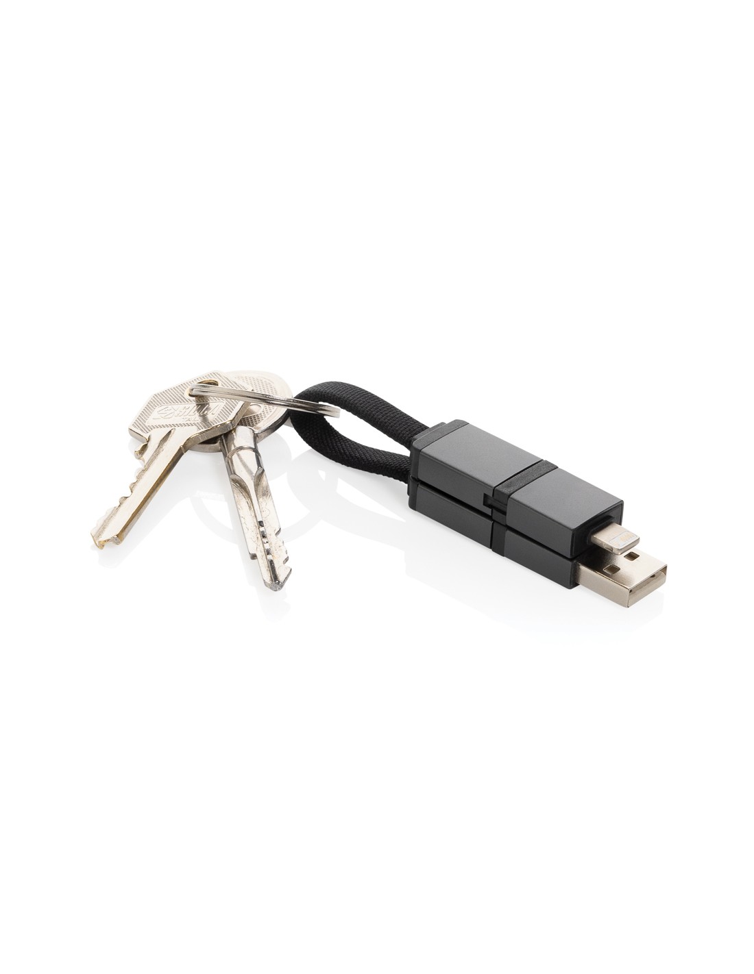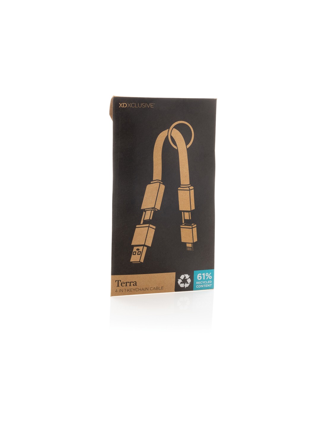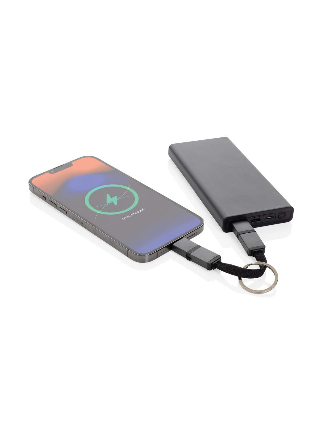 Cavo portachiavi 4in1 a ricarica rapida realizzato in TPE riciclato RCS, lega di alluminio riciclato e PET riciclato. Input USB A e type C e output iOS e type C, è adatto a ricaricare diversi dispositivi. Questo cavo di piccole dimensioni supporta una ricarica rapida da 60W. Facile da attaccare al portachiavi grazie all'anello incorporato. I connettori sono dotati di magneti all'interno per tenerli uniti durante il trasporto. Contenuto riciclato totale: 60% in base al peso totale dell'articolo. La certificazione RCS garantisce una catena di approvvigionamento completamente certificata dei materiali riciclati. Corrente massima supportata 20V/3A; confezionato in busta senza plastica. Senza PVC.