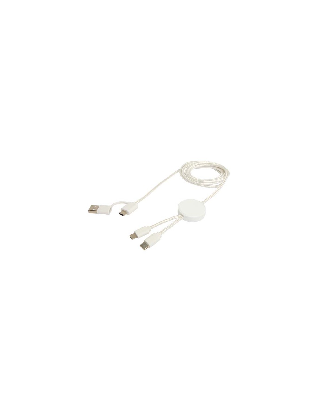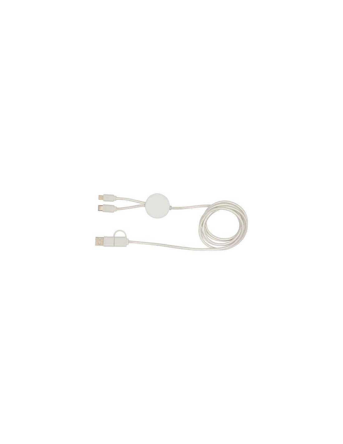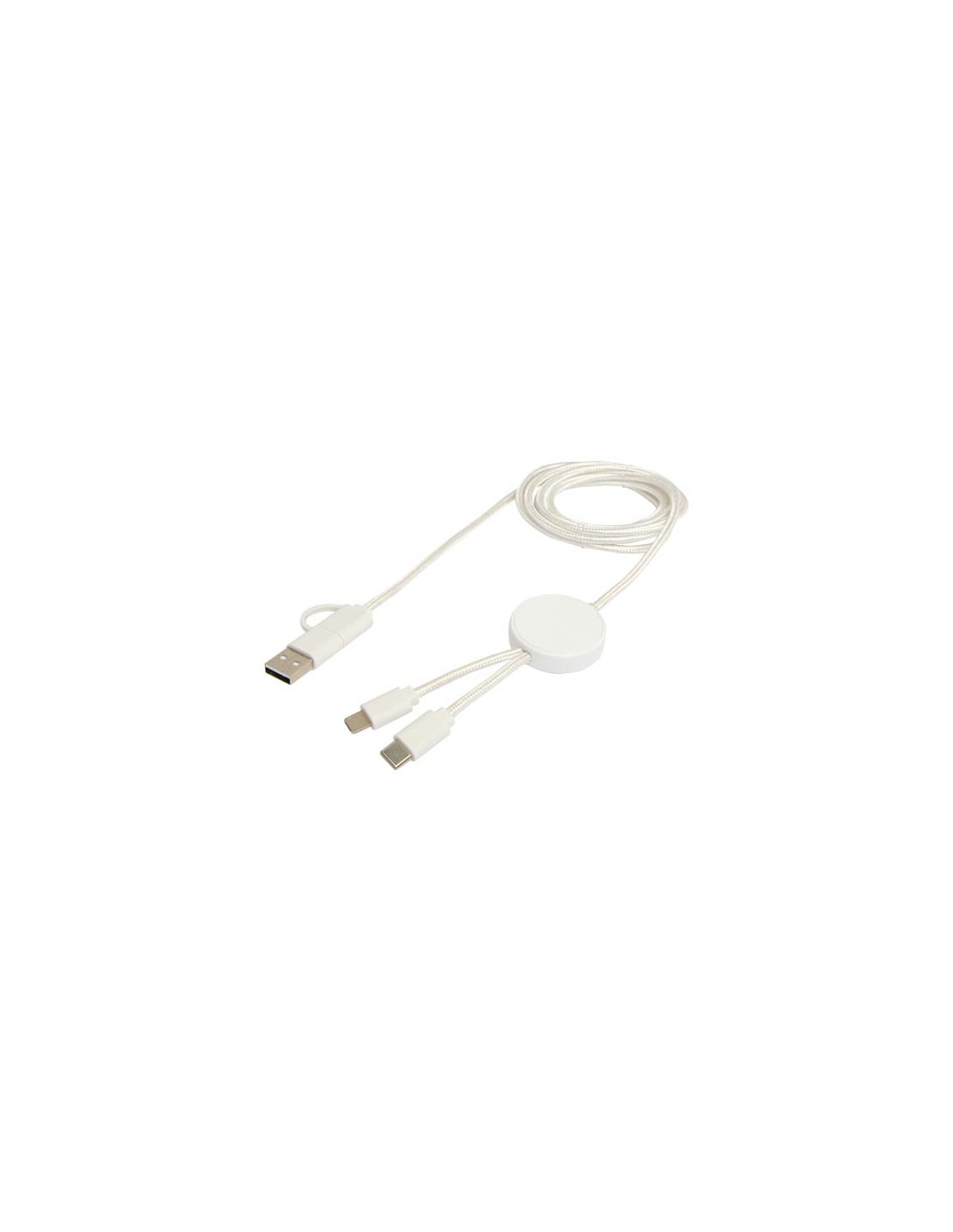 Cavo di ricarica in nylon intrecciato con 5 diversi connettori: ingresso di tipo C, ingresso USB-A, uscita di tipo C, uscita Apple® iOS e uscita micro USB. In questo modo è possibile utilizzare il cavo anche con dispositivi con uscita di tipo C della generazione più recente di telefoni e computer...