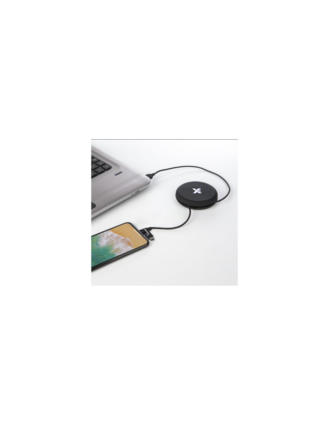 Cavo 3-in-1 per ricarica e trasferimento dati con logo luminoso, avvolgicavo e tre connettori (tipo C, Android, iPhone). Compatibile con Apple CarPlay ed Android Auto. Viene fornito in una custodia in silicone che lo rende l'accessorio perfetto in viaggio. L'imballaggio è realizzato in carta e plastica riciclata.