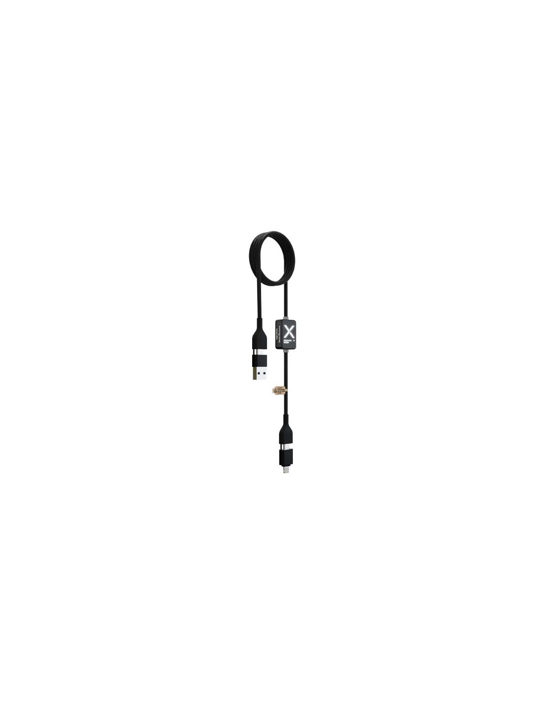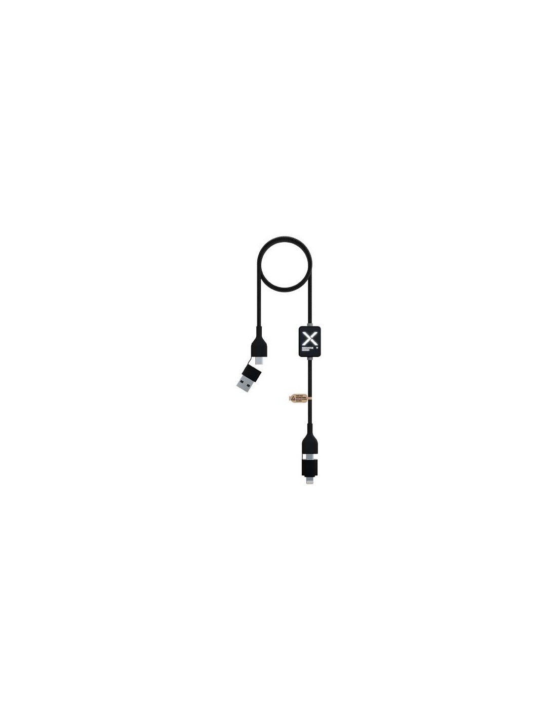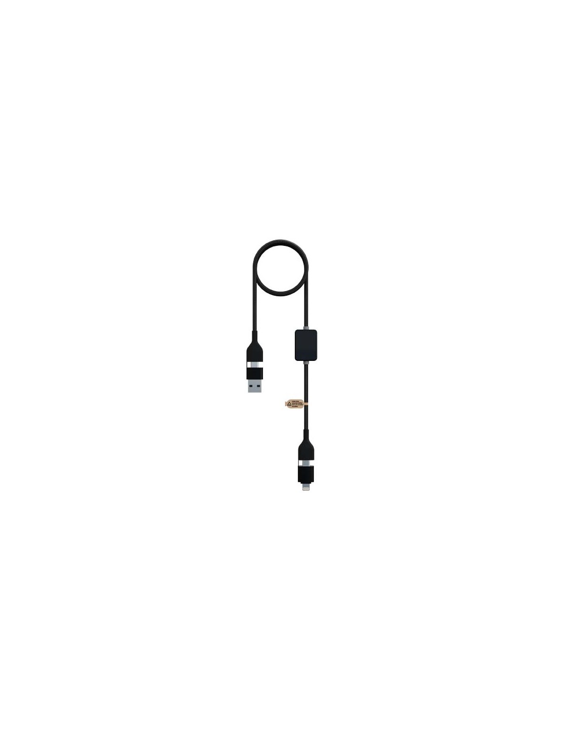 Cavo di ricarica in nylon intrecciato con 5 diversi connettori: ingresso di tipo C, ingresso USB-A, uscita di tipo C, uscita Apple® iOS e uscita micro USB. In questo modo è possibile utilizzare il cavo anche con dispositivi con uscita di tipo C della generazione più recente di telefoni e computer...