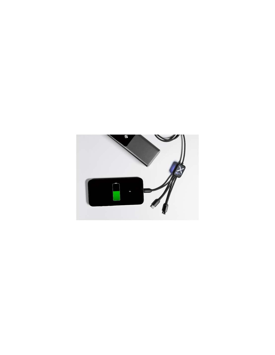 Cavo di ricarica multi-connettore da 65 W con doppio logo luminoso, tre connettori intercambiabili (USB-C, Android/Micro-USB e iPhone/Lightning) e resistenti cavi intrecciati in PET realizzato con bottiglie riciclate. Carica due o tre dispositivi contemporaneamente e può essere collegato praticamente a qualsiasi fonte di alimentazione grazie al design a doppio ingresso (USB-A + USB-C) per la piena compatibilità con computer portatili e PC. Facoltativo: i due loghi luminosi possono essere personalizzati in modo diverso. Fornito in una custodia in TPU riciclabile e una biglietto in carta riciclata.