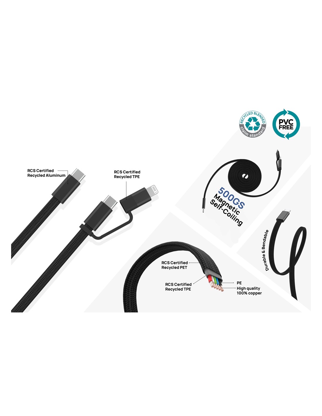Il cavo retrattile Alasia 5-in-1 per la sincronizzazione dei dati e la ricarica rapida da 45 W è realizzato in plastica riciclata con un elemento in alluminio riciclato resistente ed elegante, che lo rende una soluzione di ricarica elegante e più responsabile. Il cavo è caratterizzato da un...