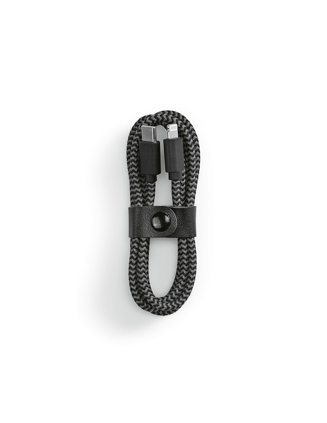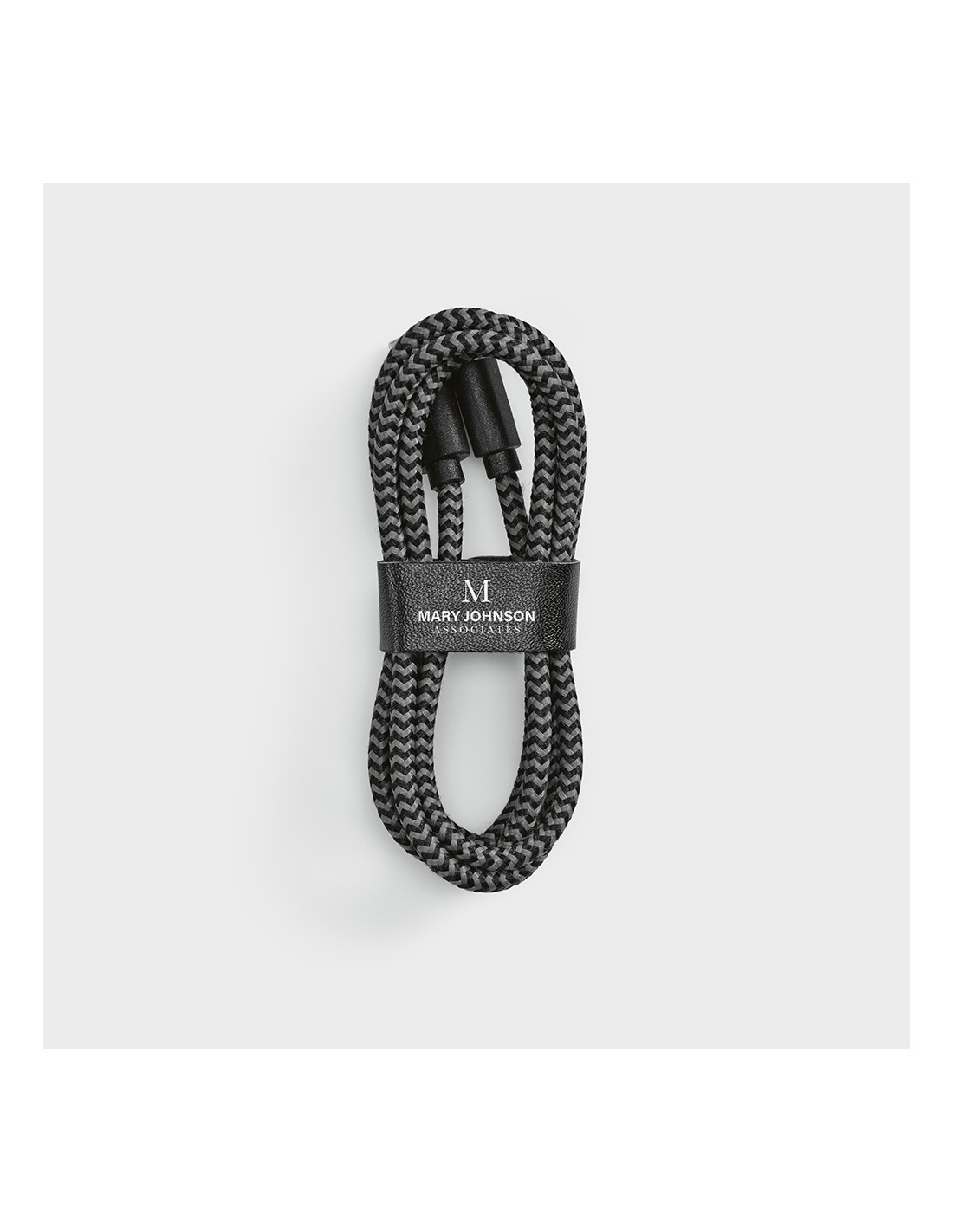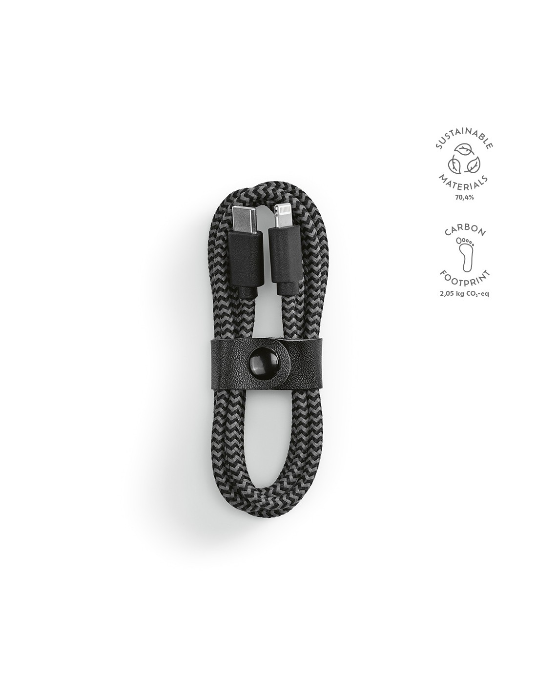 Cavo Ramanujan 1m in rPET per ricarica rapida. Connessione USB-C a Lightning senza interruzioni. Include cinturino per tenere il cavo ordinato e piegato. Ogni pezzo è confezionato in una singola bustina kraft ecologica.