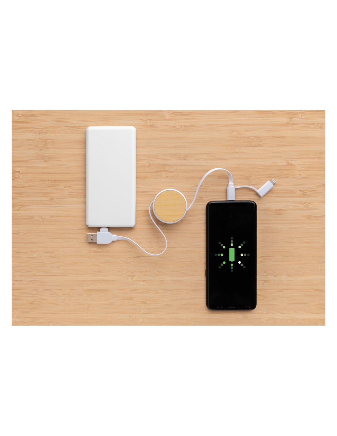 Multicavo retrattile compatto realizzato con materiali riciclati certificati. Viene fornito con 5 diversi connettori: input USB C, USB A, output type C, IOS e micro USB. Ciò consente di utilizzare il cavo anche con dispositivi con output type C come la nuova generazione di smartphone e computer MacBook. Il cavo ha anche una porta USB A in modo che possa caricare qualsiasi dispositivo da qualsiasi sorgente. Struttura in bambù FSC e ​​ABS certificato RCS. I cavi sono in TPE certificato RCS al 100%. La certificazione RCS garantisce tutta la filiera del materiale riciclato. Contenuto totale riciclato: 15% in base al peso totale dell'articolo. Lunghezza massima del cavo: 100 cm. Confezionato in busta kraft FSC mix. Senza PVC.
