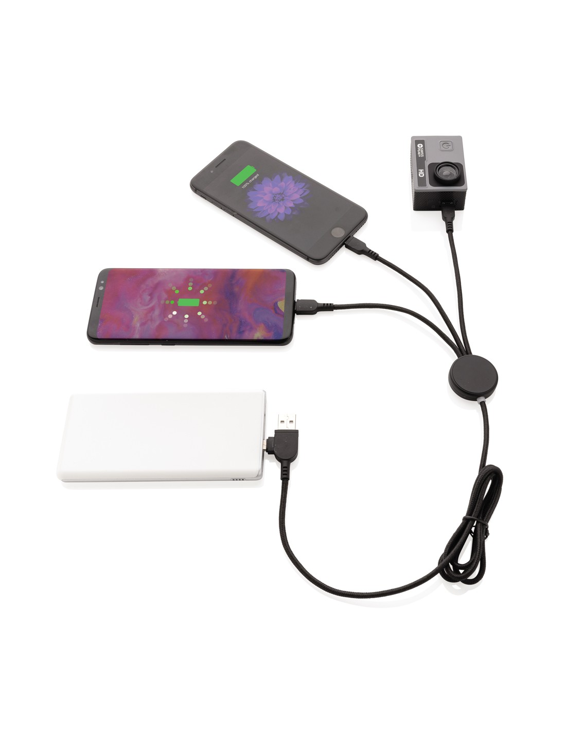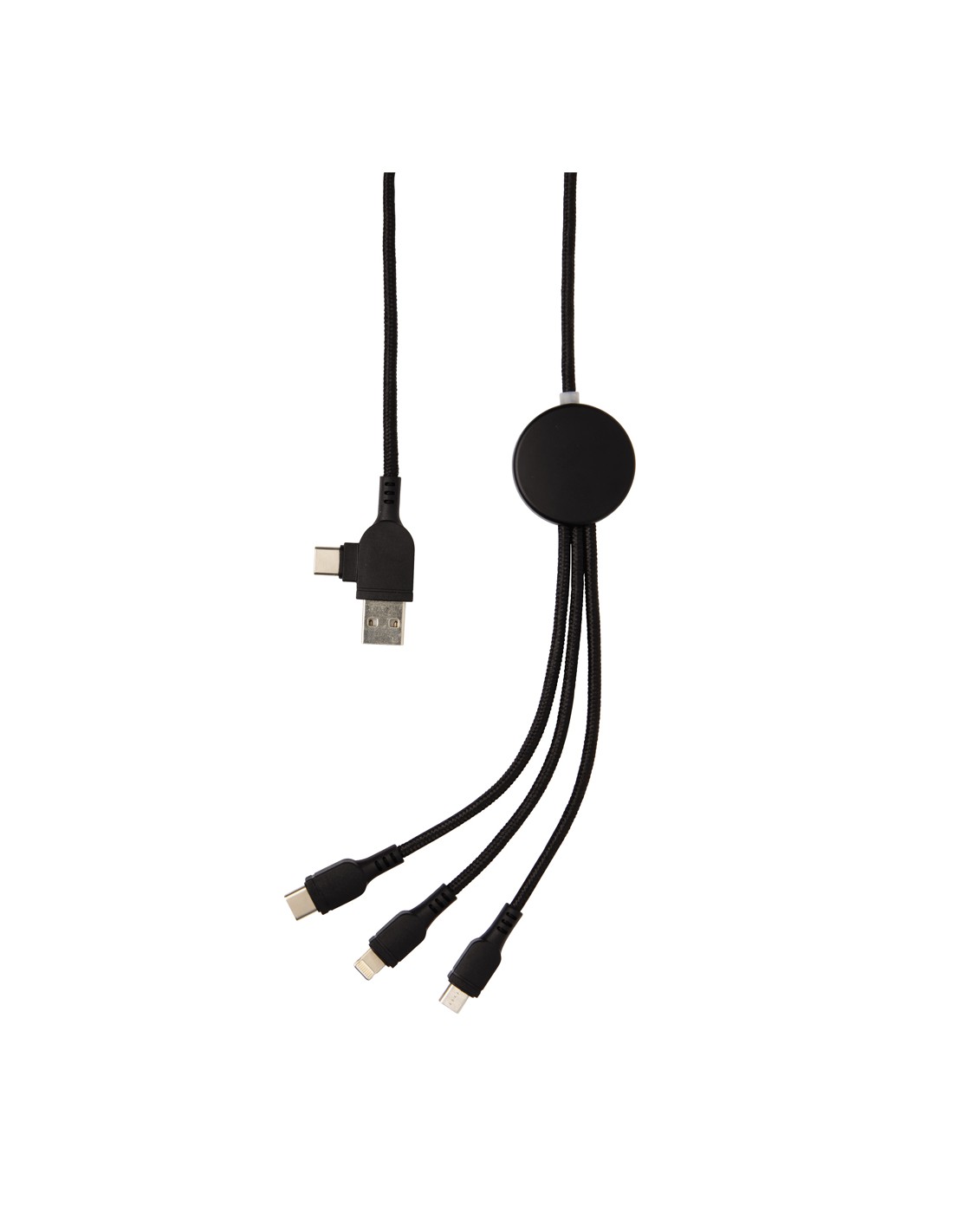 Cavo in nylon intrecciato con 5 diversi connettori: Compatto e facile da riavvolgere questo multi cavo include 5 diversi connettori: USB C e USB A in input; type C, iOS e micro USB in output. Questo ti permetterà di utilizzare il cavo anche con gli ultimissimi dispositivi elettronici con type C in output. Dispone comunque di una porta in entrata USB A per i dispositivi tradizionali. La struttura è ABS con la possibilità di incidere il logo che si illuminerà mentre usi lo utilizzi. Non contiene PVC. Lunghezza del cavo 120 cm.