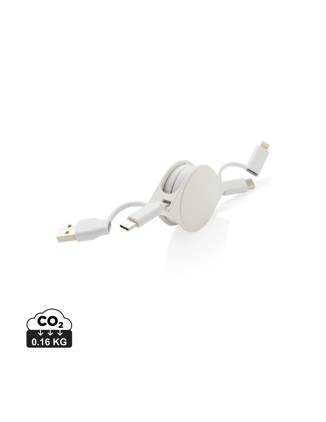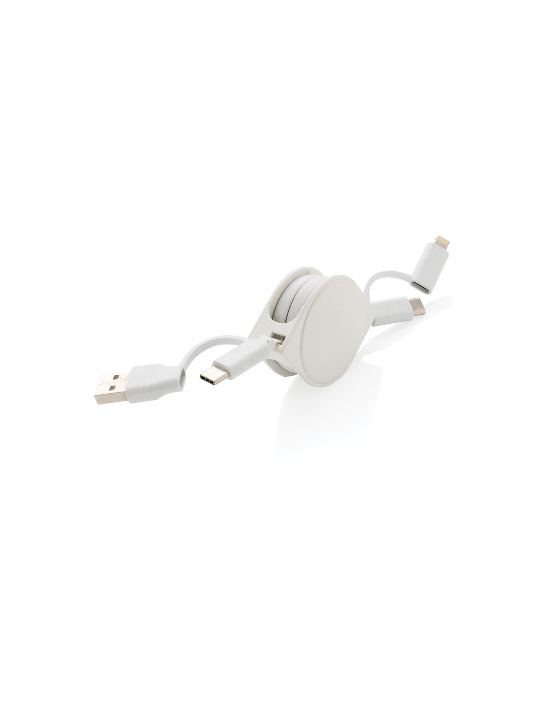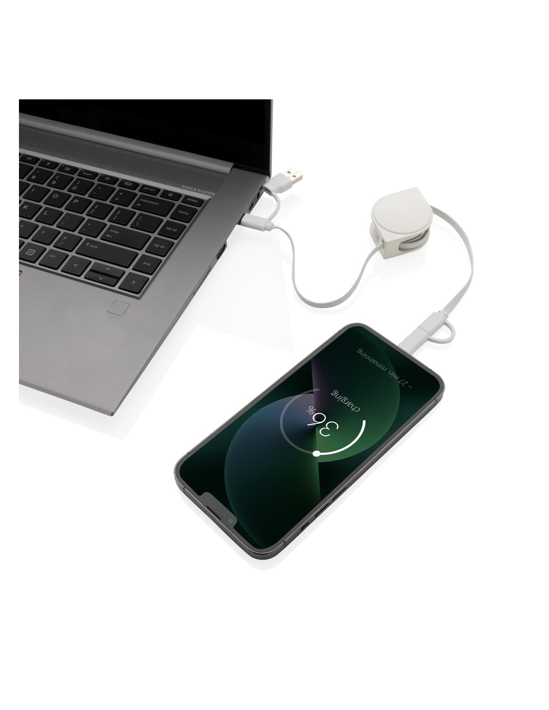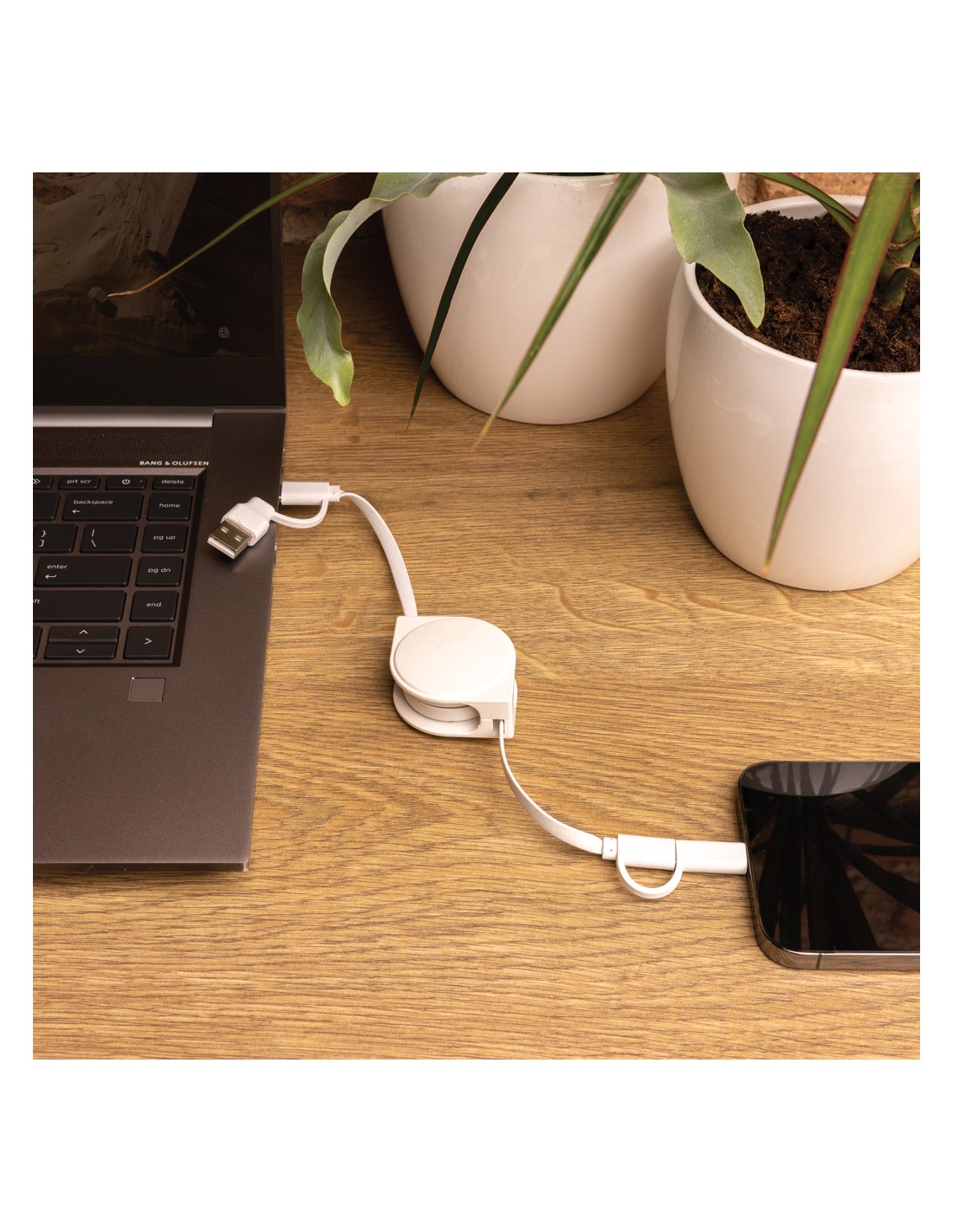 Cavo retrattile 6 in 1 con custodia in plastica ABS riciclata certificata RCS e il filo in TPE riciclato. RCS (Recycled Claim Standard) è uno standard per verificare il contenuto riciclato di un prodotto lungo l'intera catena di fornitura. RCS è lo standard che viene utilizzato quando una parte dell'articolo è stata realizzata con materiali riciclati. Con 5 diversi connettori: input USB C, input USB A, output type C, output IOS e output micro USB. Il cavo è adatto a dispositivi con output type C quali smartphone di generazione macbook. Il cavo ha anche un'opzione input e output USB A in modo che possa caricare qualsiasi dispositivo da qualsiasi sorgente di uscita. L'articolo è completamente privo di PVC.