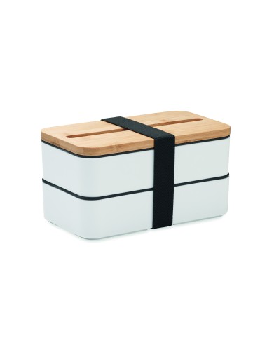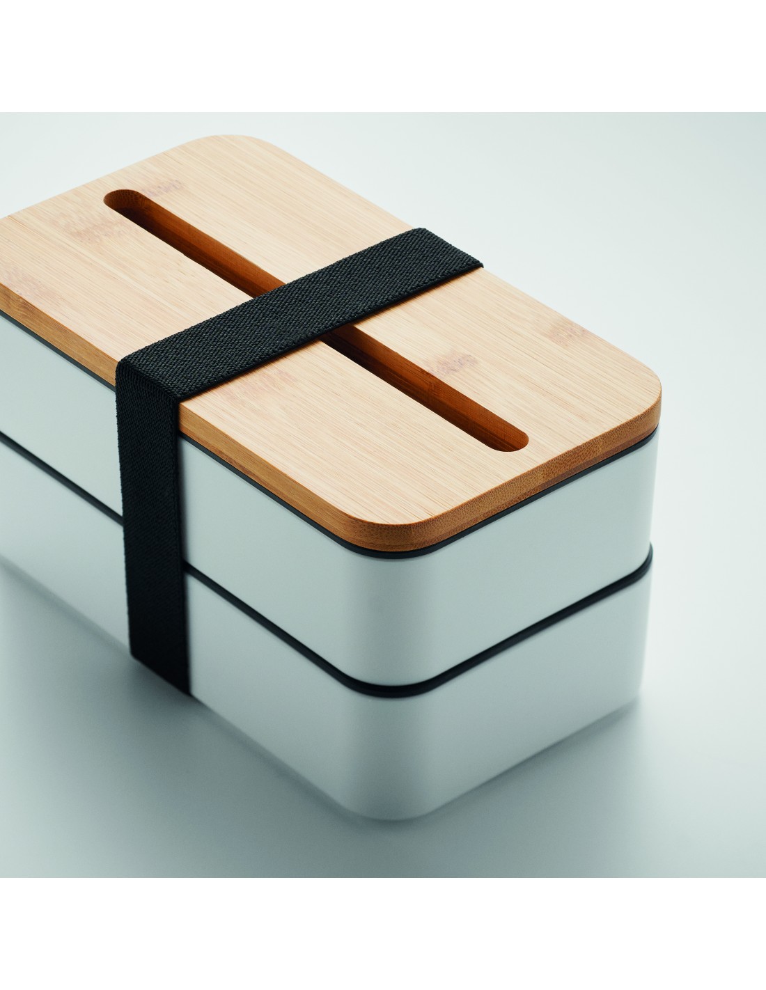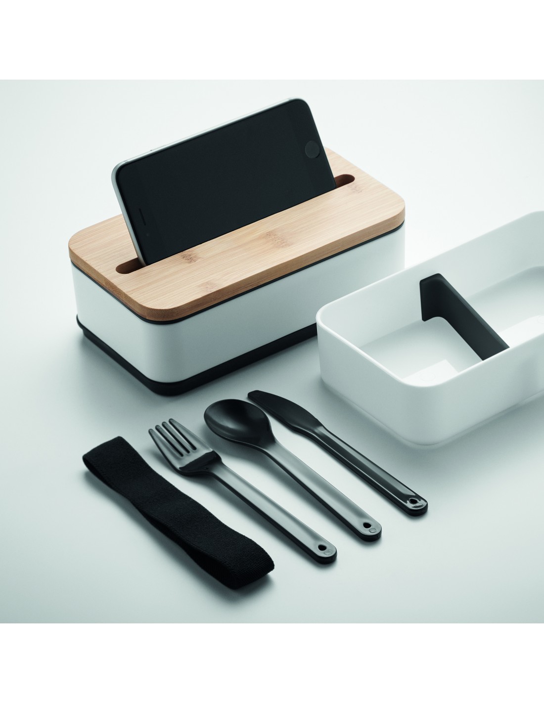 Portapranzo pranzo a due livelli in PP con divisorio rimovibile e 3 posate con fascia in poliestere e coperchio con funzione di supporto telefono in bambù. Capacità: 400 ml (2x).