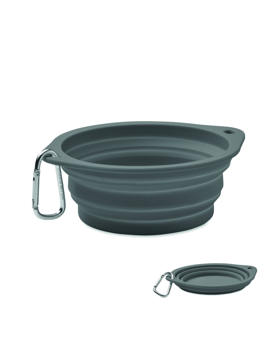 Ciotola portatile pieghevole in silicone per bere o mangiare con moschettone. Capacità: 350 ml.