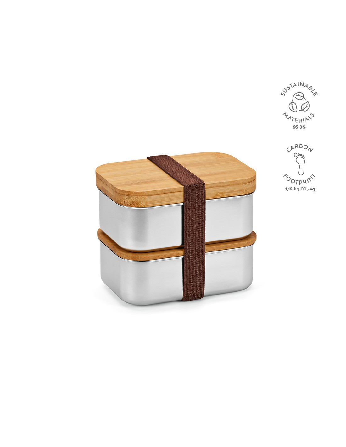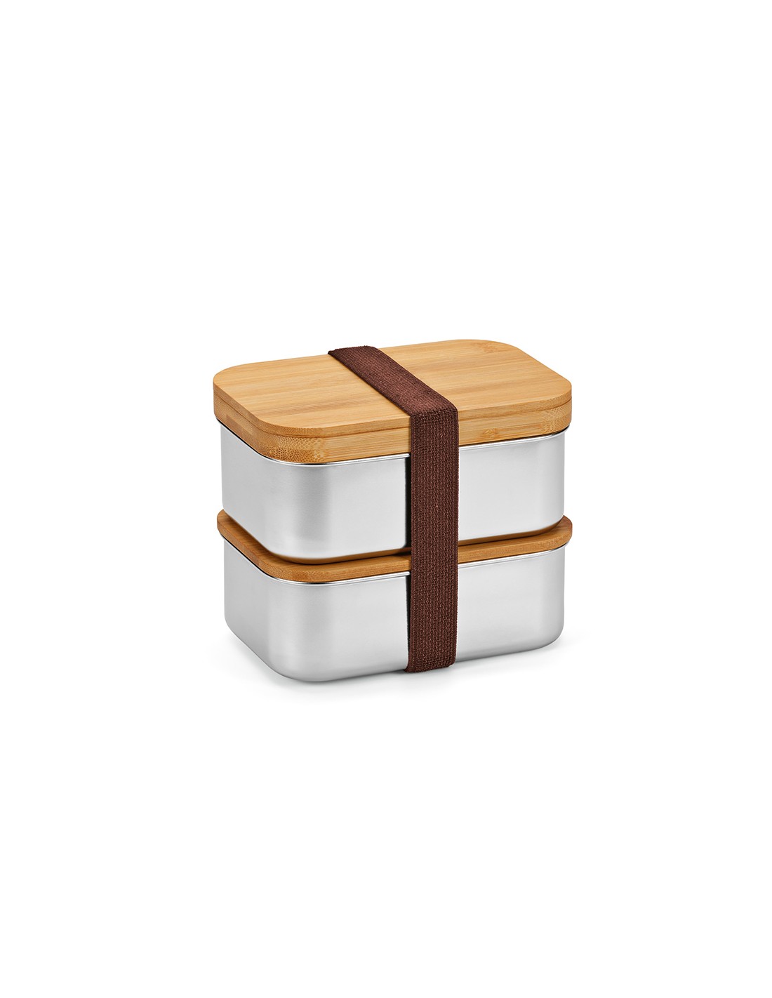 Box pranzo Vermeer con capacità totale di 1480ml (980ml net). Realizzato in acciaio inossidabile riciclato, entrambi i scomparti hanno un coperchio in bamboo. Il set include una fascia elastica per tenere uniti gli scomparti, mentre il coperchio principale ospita forchetta, coltello e cucchiaio. Tutto confezionato in un box kraft individuale.