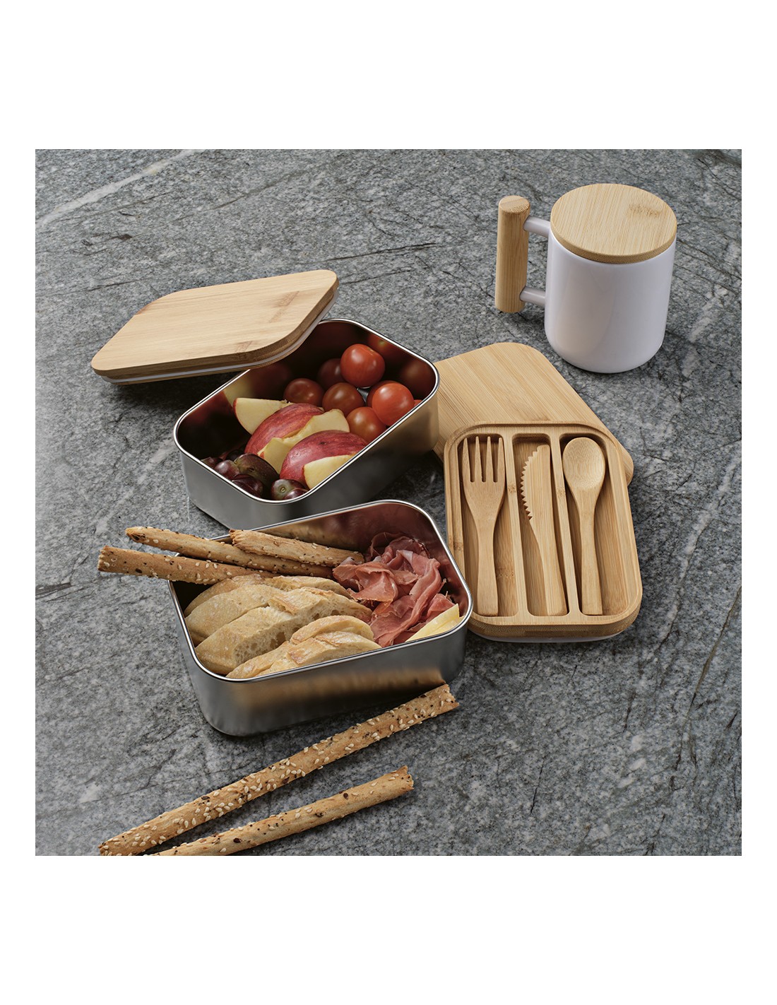 Box pranzo Vermeer 1480ml rSS con coperchio in bamboo e posate