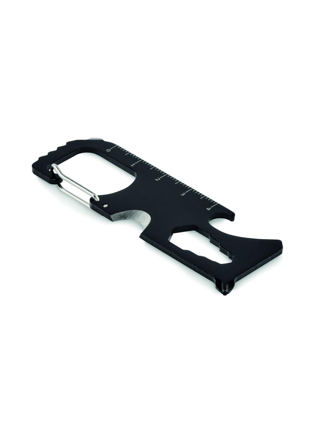 Scheda multi-tool tascabile in acciaio inossidabile. 8 funzioni: seghetto, tagliafili, chiave inglese, cacciavite Phillips, cacciavite a taglio, metro, apribottiglie e portachiavi.