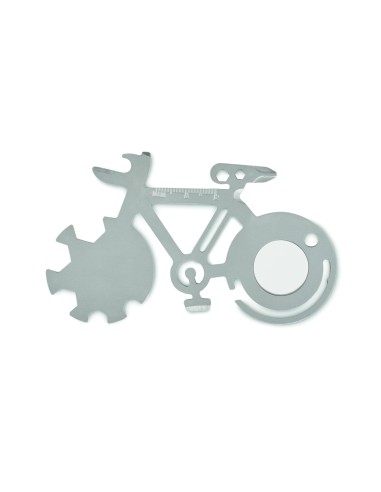 Multi-tool 11 in 1 in acciaio inox a forma di bicicletta. Funzioni: apribottiglie, coltello, righello o cacciavite a croce.