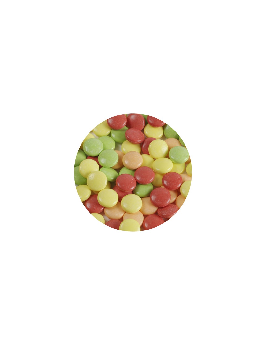 Fruit drops in contenitore di latta con facile apertura a scatto. Il contenitore può essere ordinato in una vasta gamma di colori e riempito con caramelle dai gusti diversi: mentine tradizionali, mentine extra forti, mentine senza zucchero, gelatine di frutta, caramelle a forma di cuore e al gusto fragola, cannella, caramelle al limone e menta o cioccolatini. Il coperchio può essere decorato con una stampa digitale a colori.