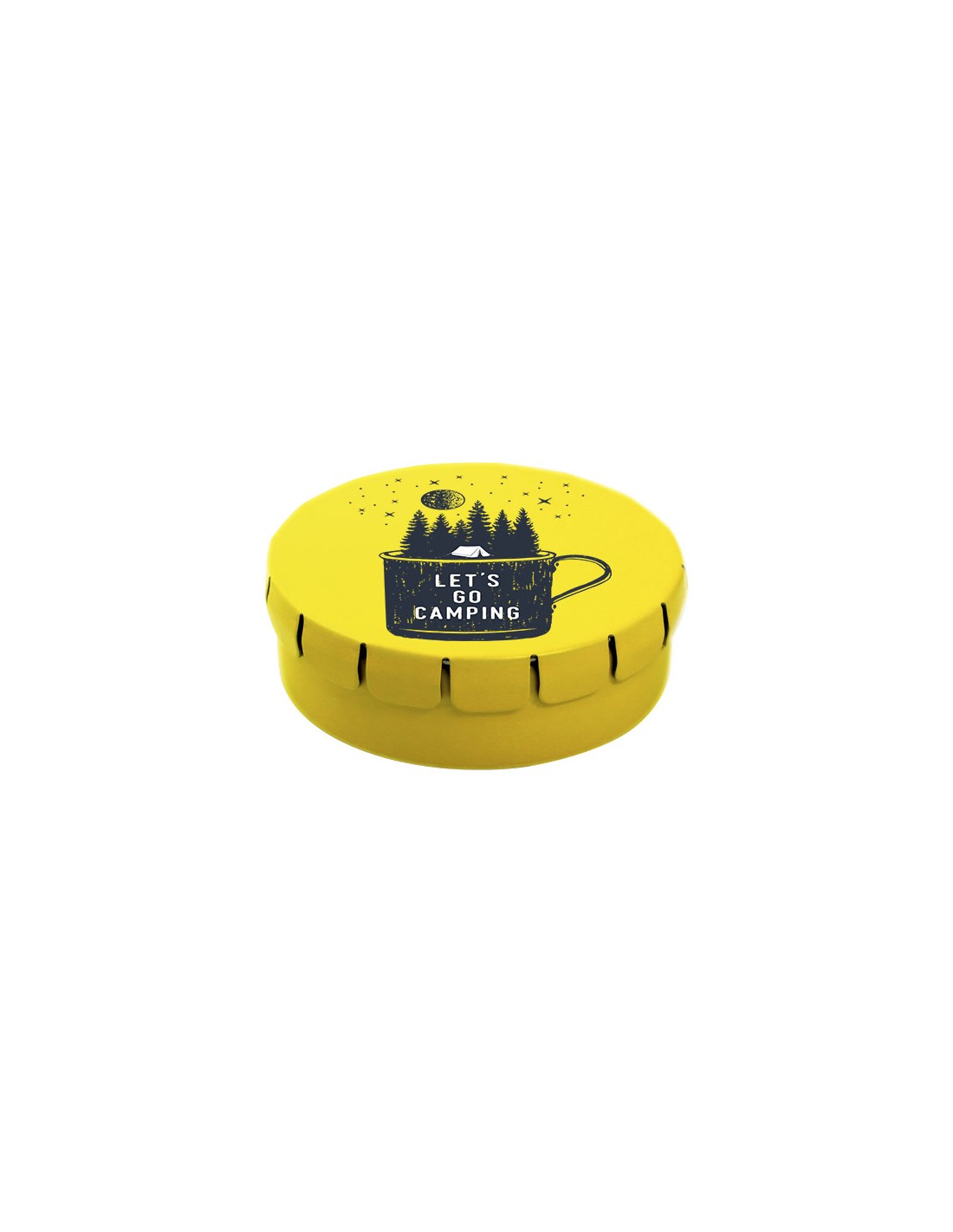 Caramelle al gusto cannella in contenitore di latta con facile apertura a scatto. Il contenitore può essere ordinato in una vasta gamma di colori e riempito con caramelle dai gusti diversi: mentine tradizionali, mentine extra forti, mentine senza zucchero, gelatine di frutta, caramelle a forma di cuore e al gusto fragola, cannella, caramelle al limone e menta o cioccolatini. Il coperchio può essere decorato con una stampa digitale a colori.