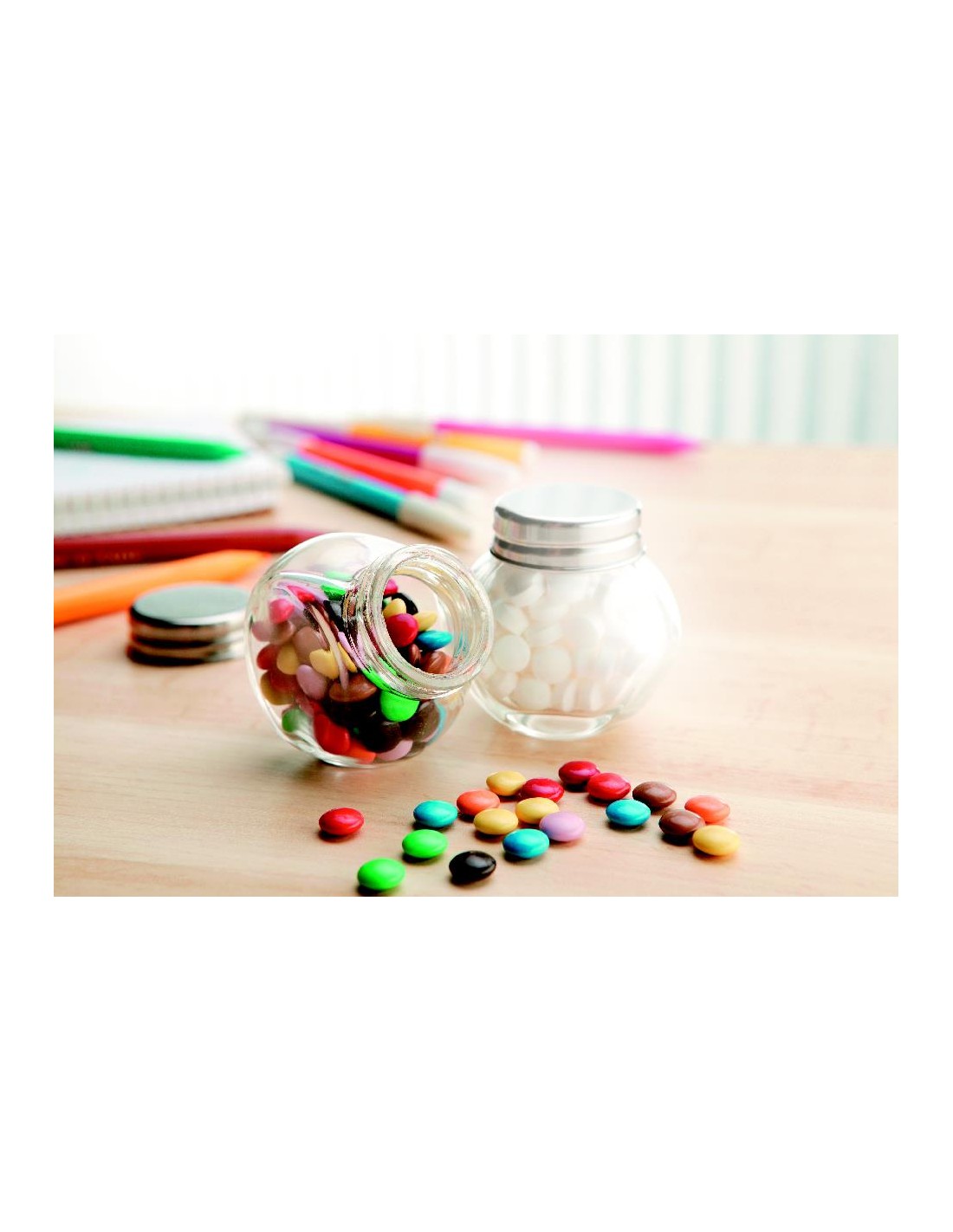 Barattolo di vetro con 40 grammi di caramelle al cioccolato, tappo metallico.