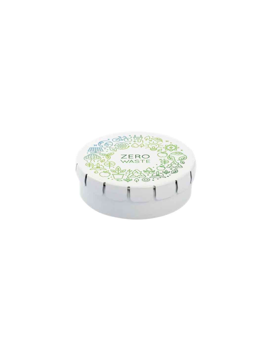 Mentine senza zucchero in contenitore di latta con facile apertura a scatto. Il contenitore può essere ordinato in una vasta gamma di colori e riempito con caramelle dai gusti diversi: mentine tradizionali, mentine extra forti, mentine senza zucchero, gelatine di frutta, caramelle a forma di cuore e al gusto fragola, cannella, caramelle al limone e menta o cioccolatini. Il coperchio può essere decorato con una stampa digitale a colori.