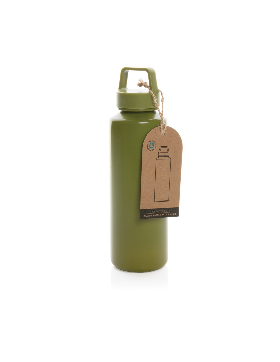 Questa bellissima bottiglia con manico è realizzata con PP riciclato certificato RCS. La certificazione RCS garantisce una filiera completamente certificata dei materiali riciclati. E' dotata di un coperchio girevole a tenuta stagna ideale da utilizzare durante i tuoi spostamenti. Contenuto totale riciclato: 97% in base al peso totale dell'articolo. Senza BPA. Capacità 500 ml. È incluso un tag kraft certificato FSC®.