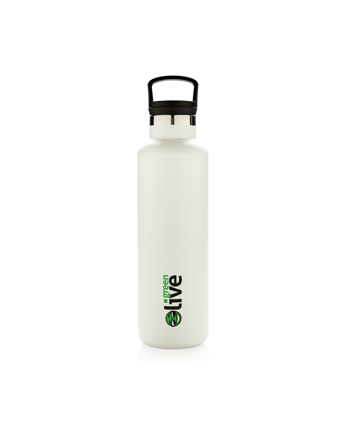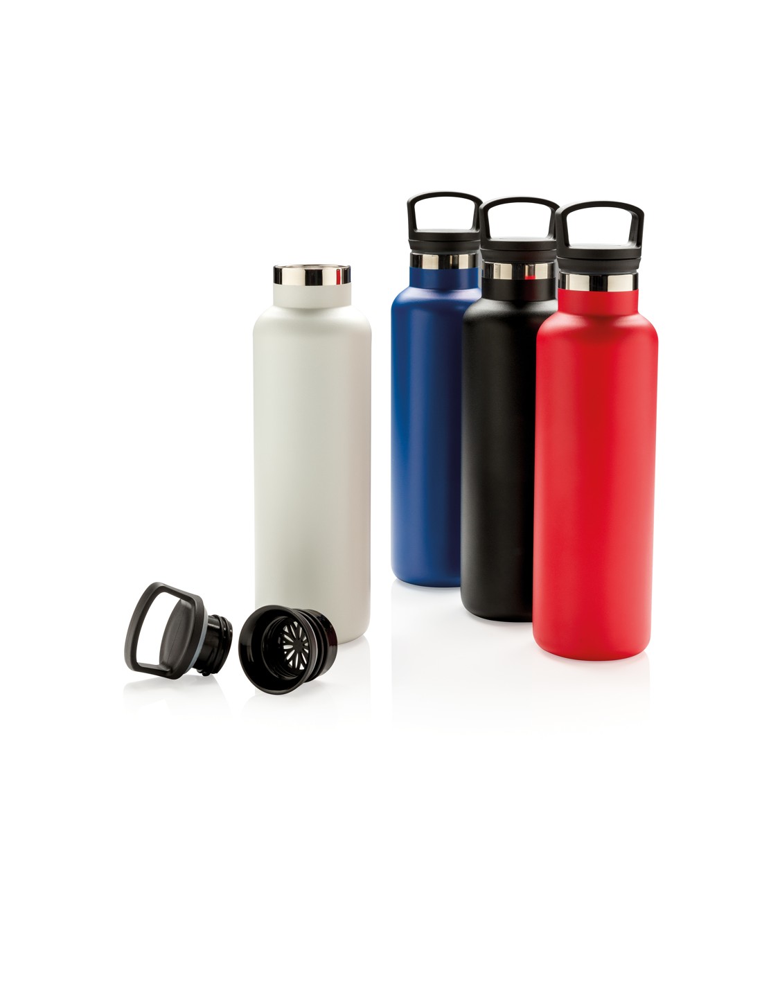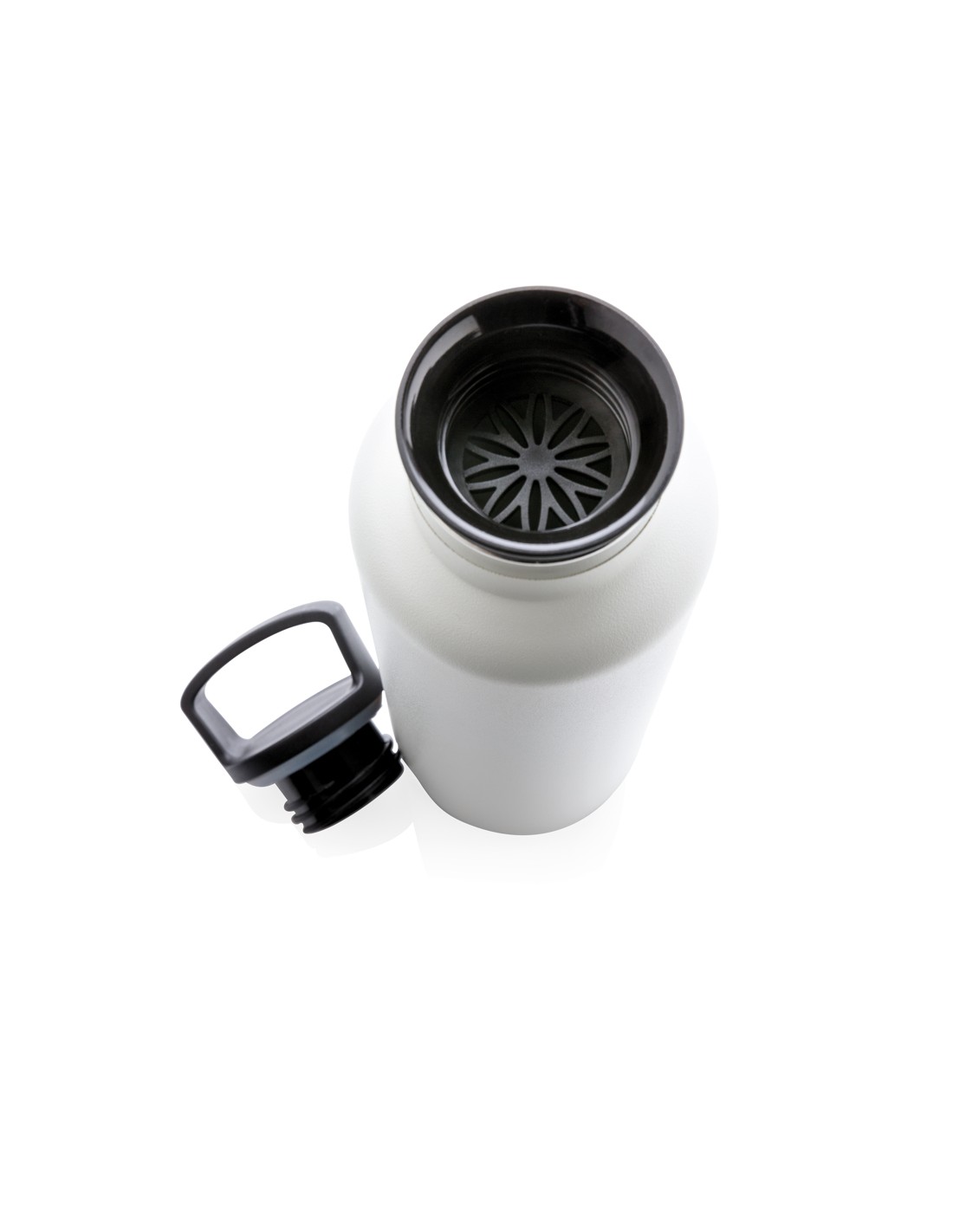 Bottiglia isolata a vuoto con finiture sabbiate. Tappo 2 in 1 con filtro ideale per infusi o te caldi. L'apertura standard ti consente di sorseggiare facilmente o aggiungere cubetti di ghiaccio. Fatta per durare, ideale in ogni circostanza. La parete interna in acciaio inossidabile 304 e la parete esterna in acciaio inossidabile 201 mantengono le tue bevande calde per 5 ore e fredde per 15. In più colori. Il colore 'bianco sporco' è PMS Cool Gray 1. Capacità 600 ml.