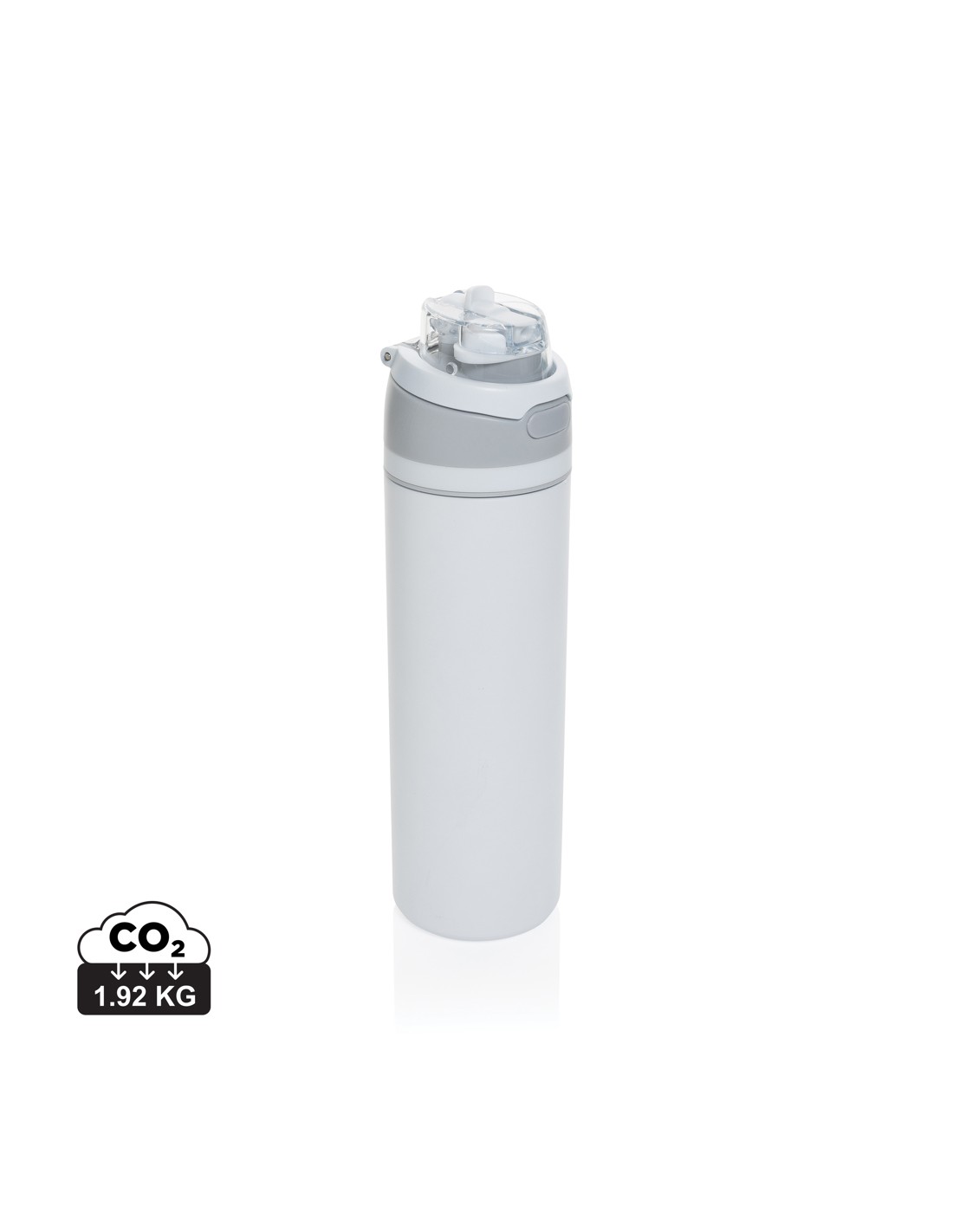 Borraccia realizzata in PET riciclato certificato RCS, dotata di un comodo manico in silicone per il trasporto. In conformità con il processo di riciclaggio del PET approvato dall'EFSA. Capacità: 630 ml.