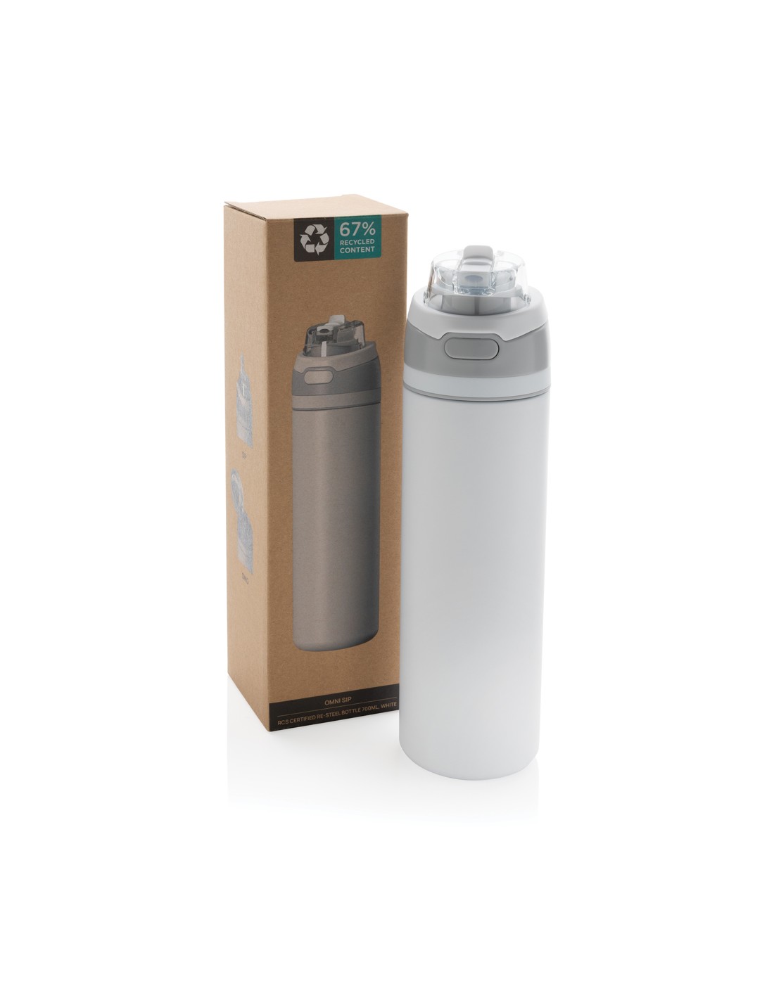 Vi presentiamo la bottiglia d'acqua Omni Sip. Vi meritate la versatilità nella vostra routine di idratazione, ed è per questo che abbiamo creato la Omni Sip. Questa bottiglia innovativa vi permette di scegliere come bere. Potete sorseggiare attraverso la cannuccia incorporata tenendola in posizione verticale, oppure inclinarla all'indietro per godervi un sorso dall'ampia apertura. Per essere pronti all'azione in qualsiasi momento, è sufficiente premere il pulsante per aprire il tappo e spingerlo di nuovo verso il basso per chiuderlo in modo sicuro, per tenere lontani sporco e germi. Contenuto di 720 ml e realizzata in acciaio riciclato certificato RCS. Omni Sip è completamente a prova di perdite. Confezionata in una scatola regalo FSC. Contenuto totale riciclato 67% in base al peso totale dell'articolo.