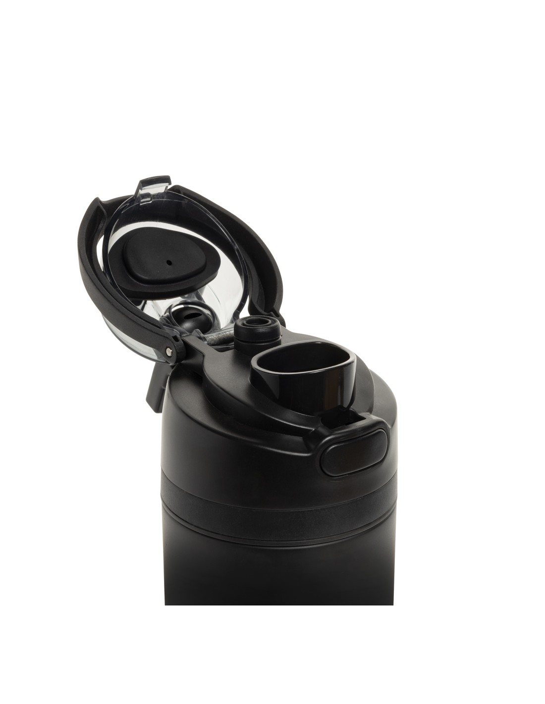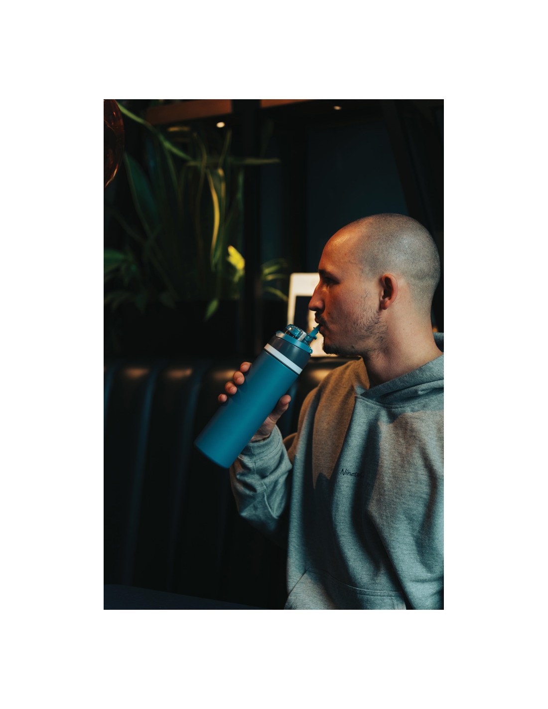 Borraccia realizzata in PET riciclato certificato RCS, dotata di un comodo manico in silicone per il trasporto. In conformità con il processo di riciclaggio del PET approvato dall'EFSA. Capacità: 630 ml.