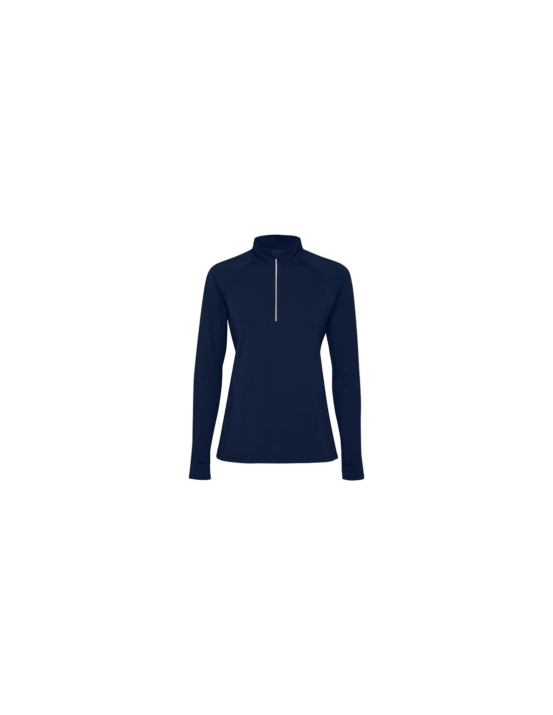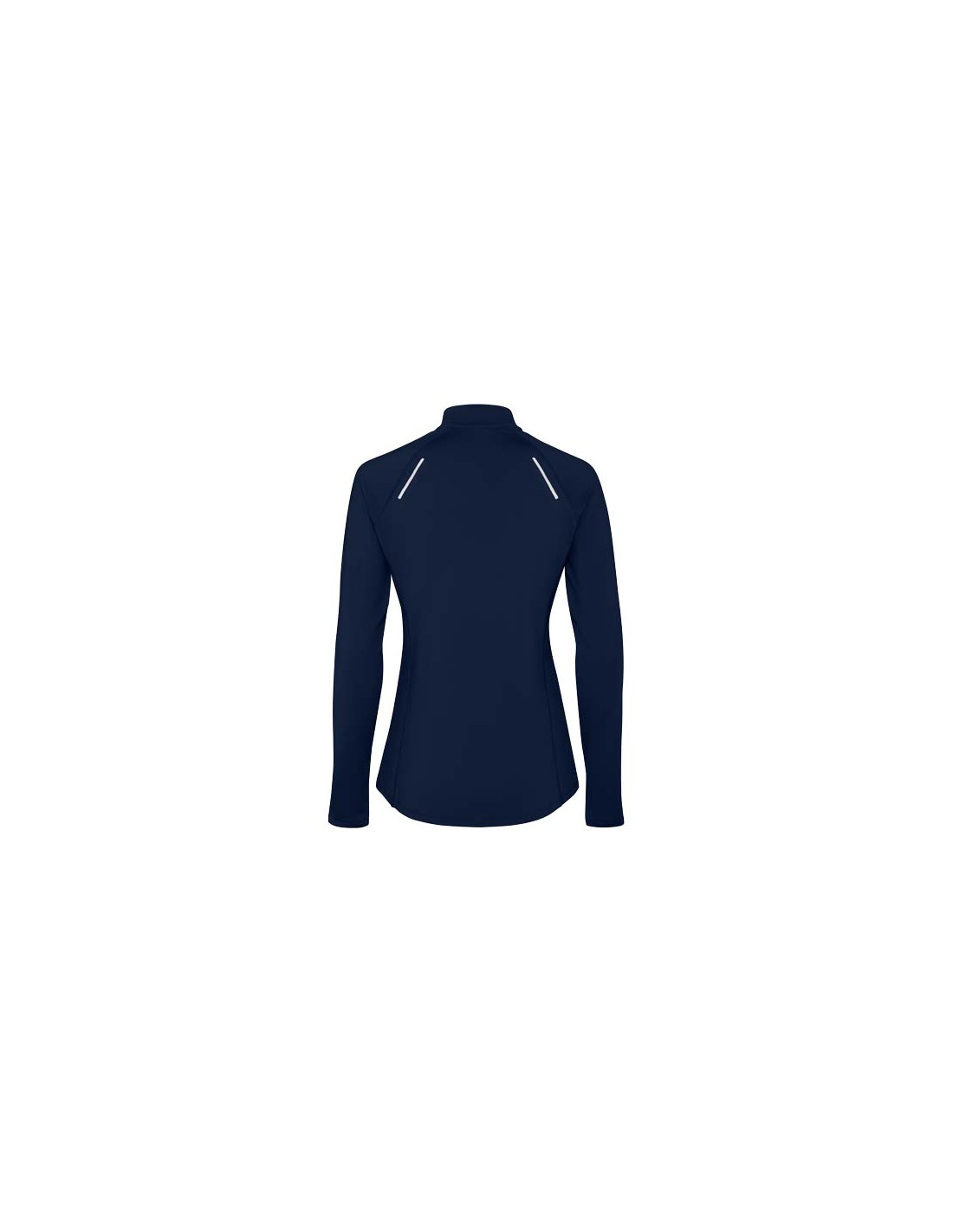Felpa tecnica da donna a maniche lunghe raglan. Aderente. Collo con design a mezza zip invertita caratterizzato da dettagli riflettenti. Coperture per cuciture rinforzate. Polsini con aperture per i pollici. Dettagli catarifrangenti sul retro. Orlo posteriore leggermente più lungo di quello anteriore. Caldo tessuto interno spazzolato.