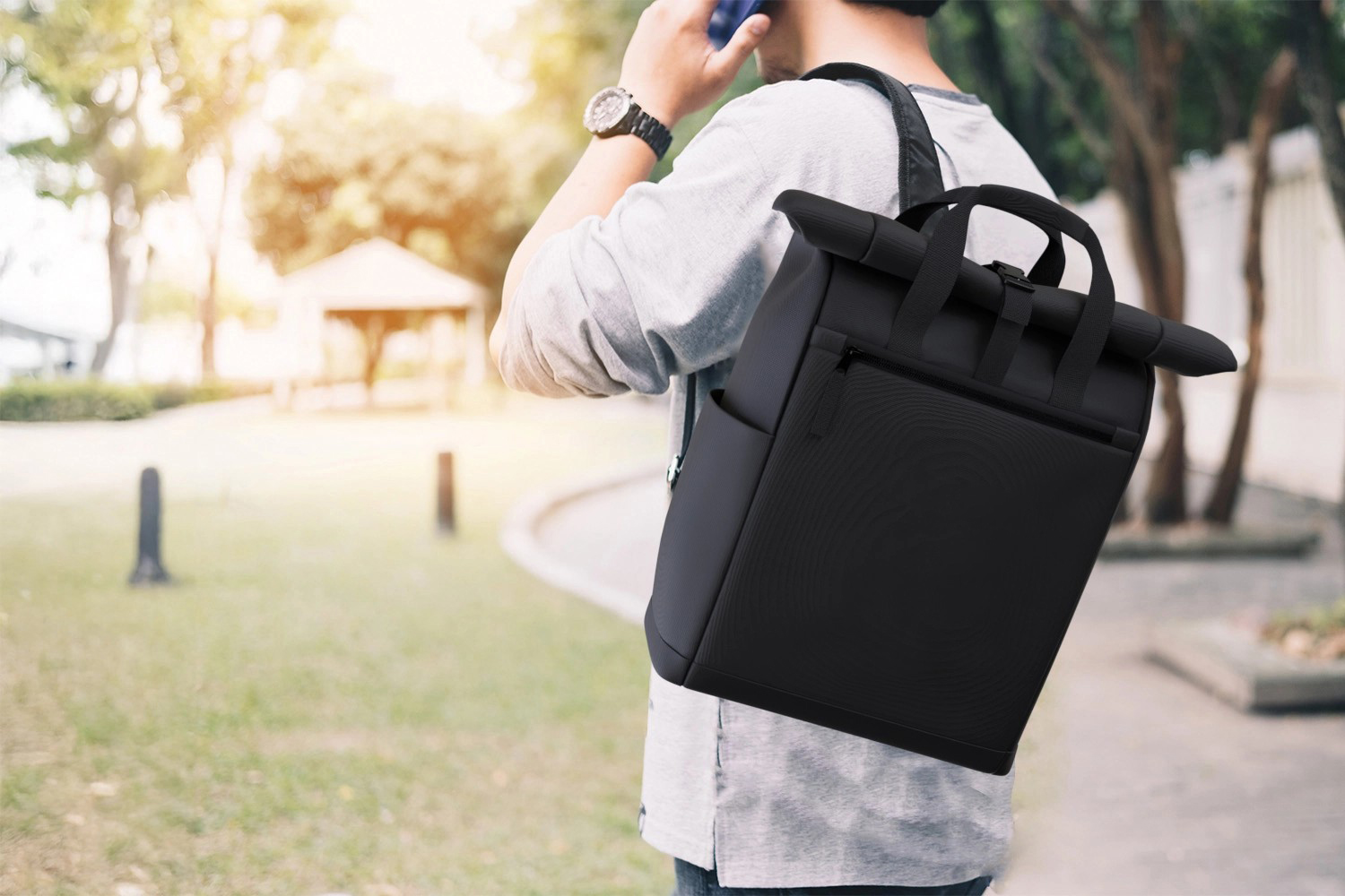 Borsa per bicicletta impermeabile con chiusura roll-top realizzata con materiali riciclati certificati GRS. Presenta uno scomparto imbottito per portatile da 15", diverse tasche con funzionalità organizzative, una chiusura a strappo regolabile per montarla facilmente su diversi tipi di biciclette...