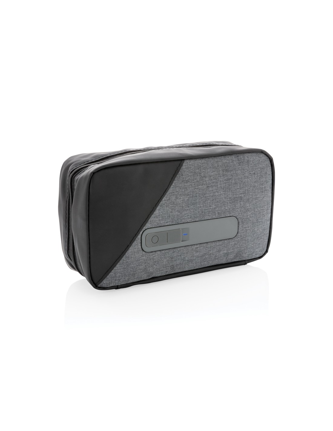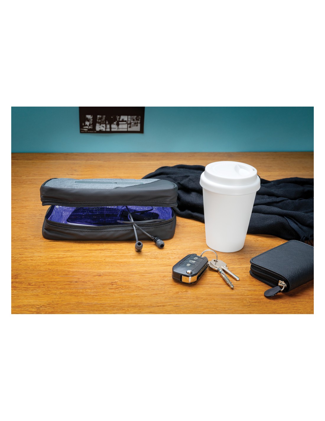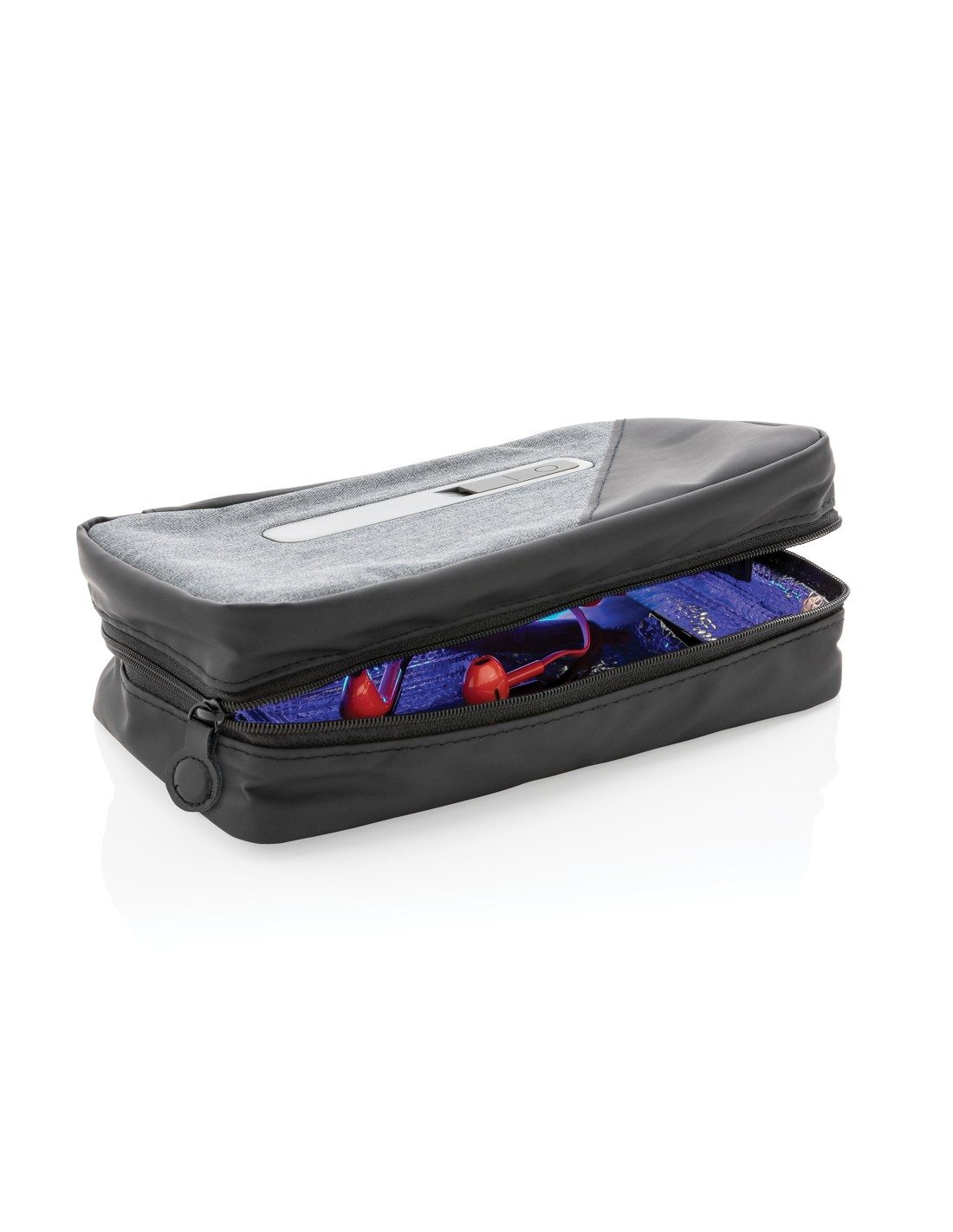Tieni puliti i tuoi effetti personali ovunque tu vada, uccidendo fino al 99,9% dei batteri sugli oggetti inseriti nella custodia. Perfetto per disinfettare le chiavi e il telefono in viaggio: 5 minuti in modalità veloce o 10 minuti per una pulizia completa. Le tre luci LED UV-C all'interno sono atossiche e prive di mercurio. Il design garantirà inoltre che la luce LED UV-C si spenga automaticamente quando la custodia viene bloccata tramite cerniera e chiusura magnetica evitando cosi' di esporre l'utente alla luce UV-C. Ha una batteria integrata da 400 mAh. Materiale esterno: poliestere 600D e PU. Completo di cavo di ricarica in materiale TPE senza PVC. Lunghezza d'onda UV-C 270nm-280nm.