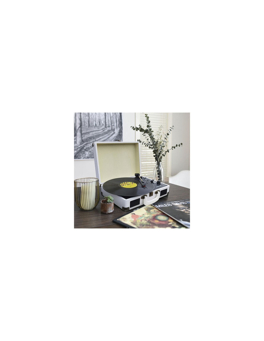 Lettore di vinile e musica tramite Bluetooth, USB, TF e radio FM. Digitalizza il vinile in formato WAV attraverso l'ingresso USB e lo slot TF. Dispone di uscite RCA per l'audio e per le cuffie. Inclusa una puntina a stilo rubino per riprodurre i dischi delicatamente. Con design a forma di valigetta. Collega un telefono cellulare al Bluetooth e utilizza la funzione di speaker. Velocità: 33,3/45/78 giri/min. Testina rubino inclusa.