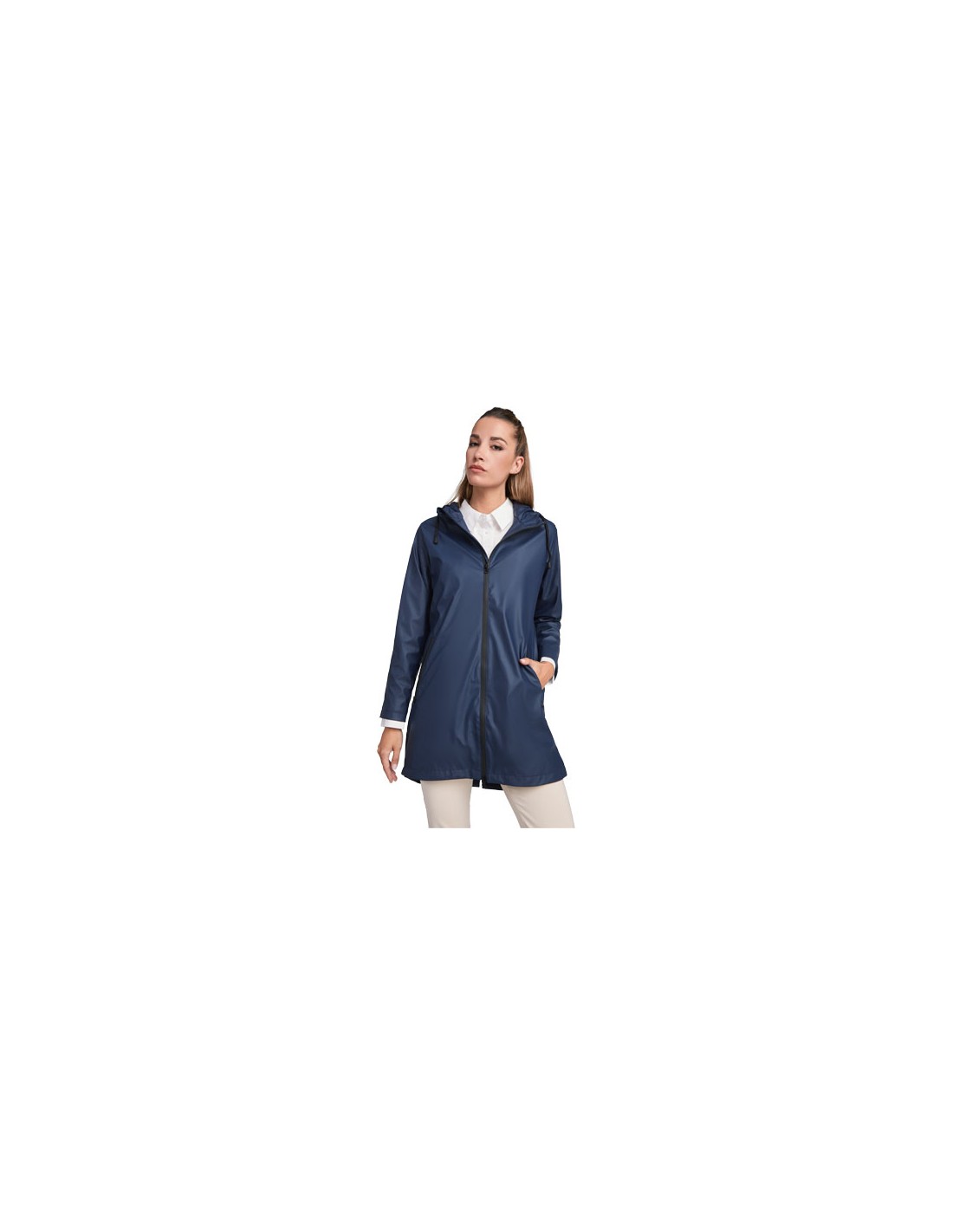 Giacca impermeabile da donna. Cappuccio con visiera. Cerniere e cuciture termosaldate. Dettagli a contrasto di colore nero. Due tasche laterali con cerniera. Fessure sul retro del cappuccio. Etichetta rimovibile. Impermeabile. La modella è alta 179 cm ed indossa una taglia S.