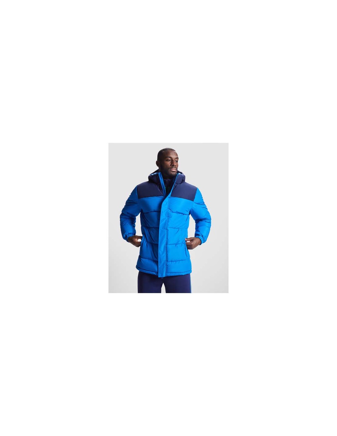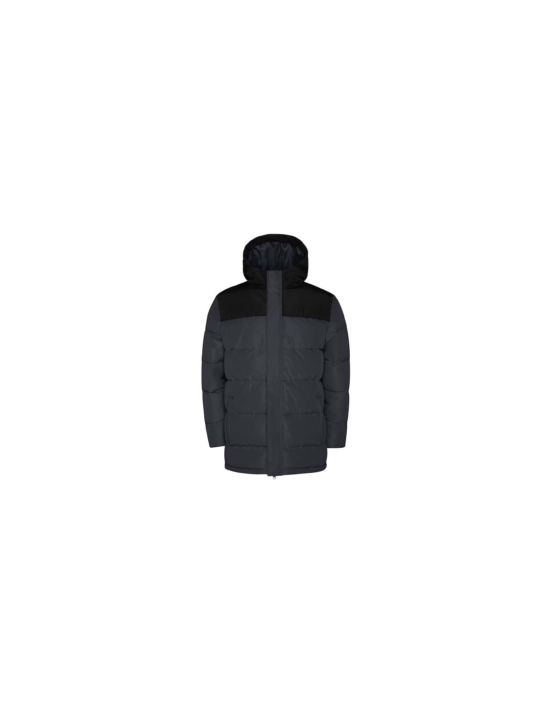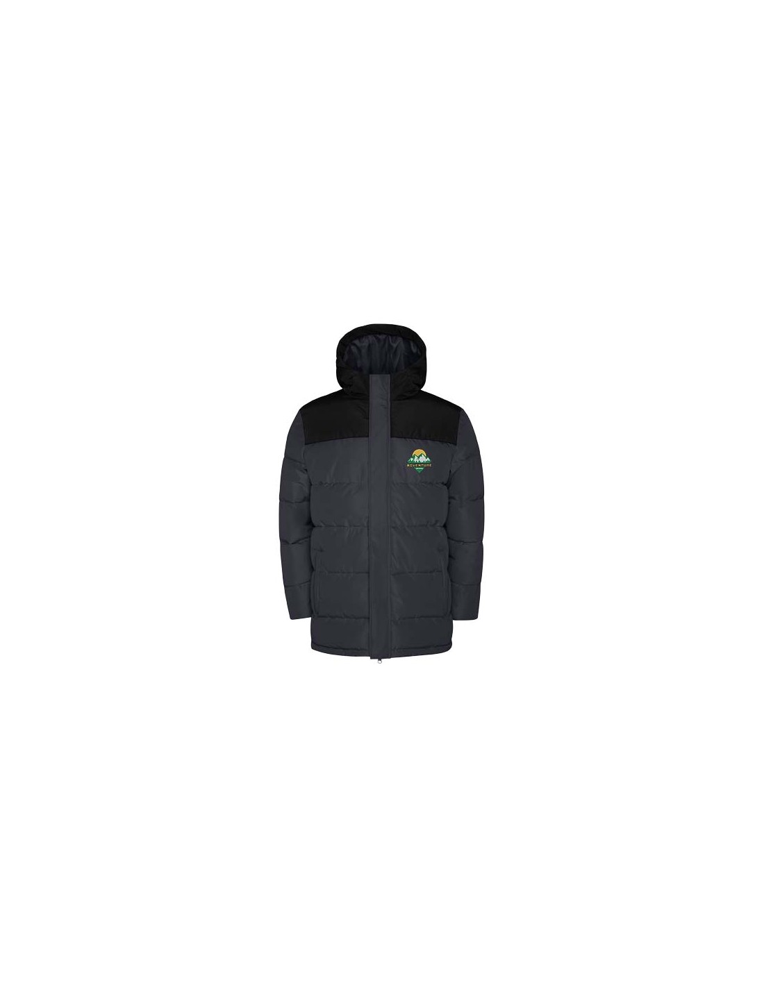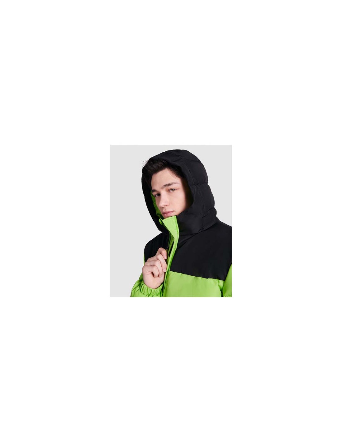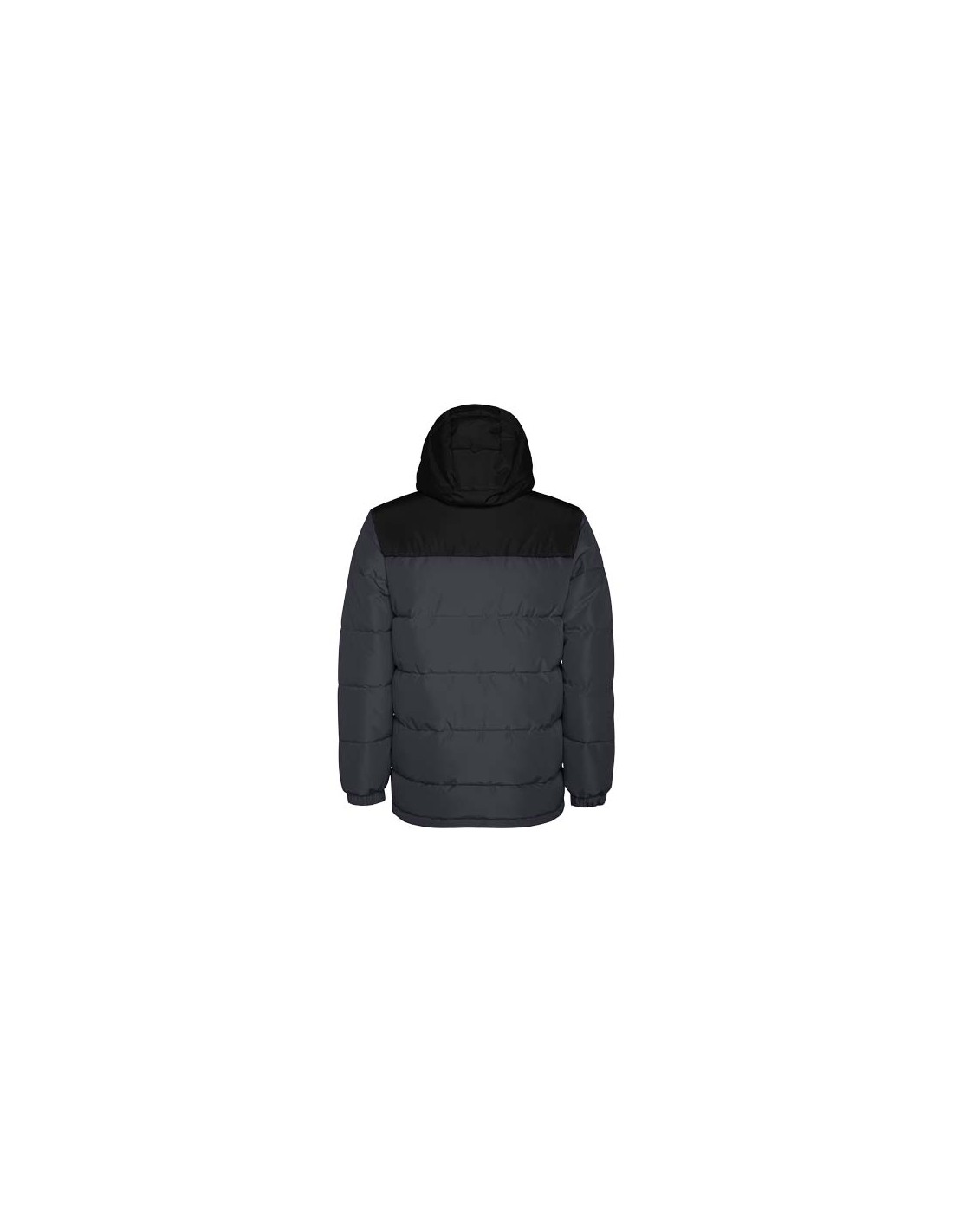 Giacca imbottita con cappuccio fisso. Cerniera anteriore coperta da una pattina. Proteggi mento. Due tasche laterali con zip. Polsini elasticizzati.