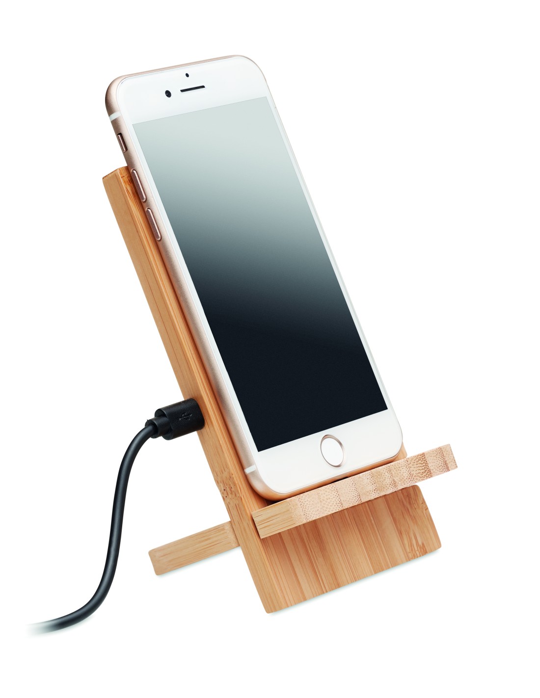 Supporto per caricabatterie wireless a doppia bobina in bamboo. Posizionare sopra lo smartphone per iniziare la carica. Composto da 2 parti da montare. Uscita: DC 9V/1.1A (10W). FSC 100% | N5.7 | FSC-C213206