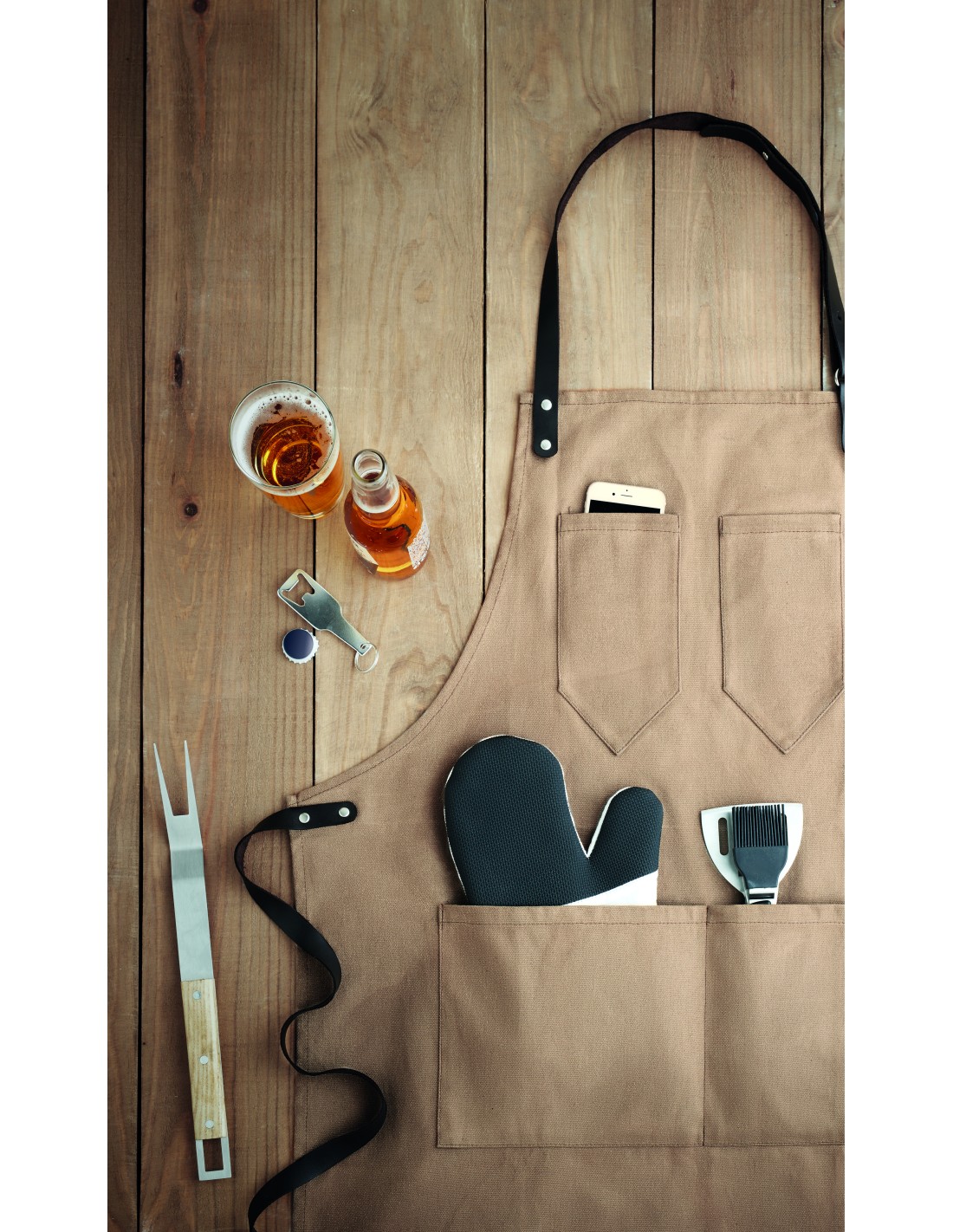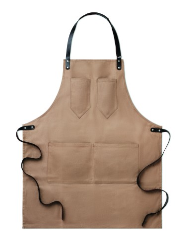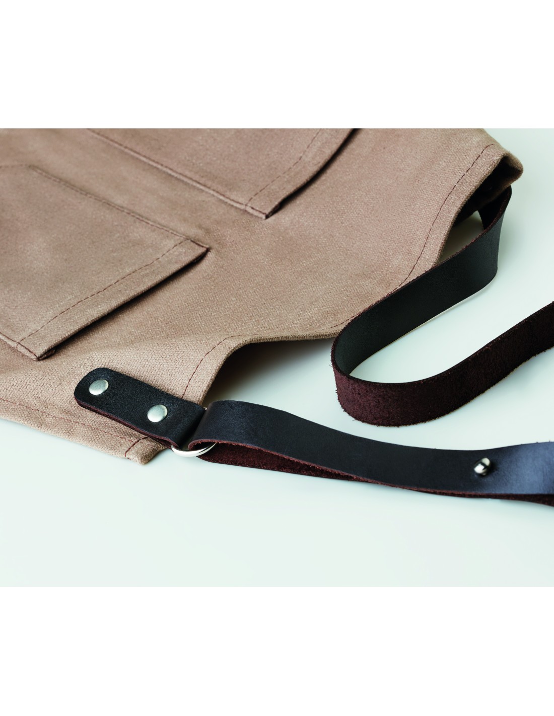 Grembiule regolabile in canvas cerato con dettagli in pelle. 2 tasche sul petto e una più grande sulla pancia.