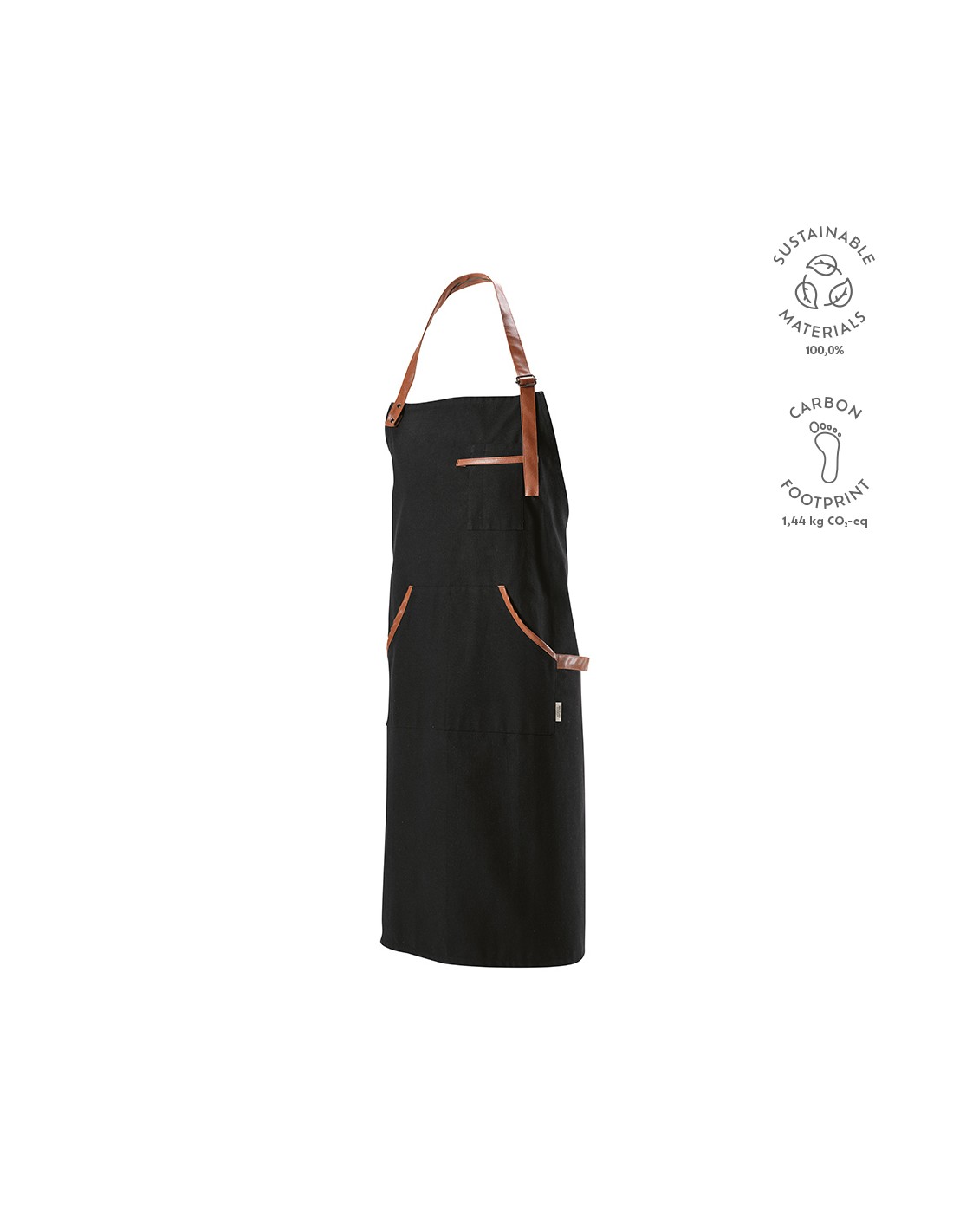 Grembiule Goya realizzato in cotone riciclato 300gsm (70%) e rPET (30%) con dettagli in PU riciclato. Le due capienti tasche frontali e la pratica tasca superiore tengono le tue ricette a portata di mano. Misura 80x100cm e confezionato in una scatola kraft sostenibile.