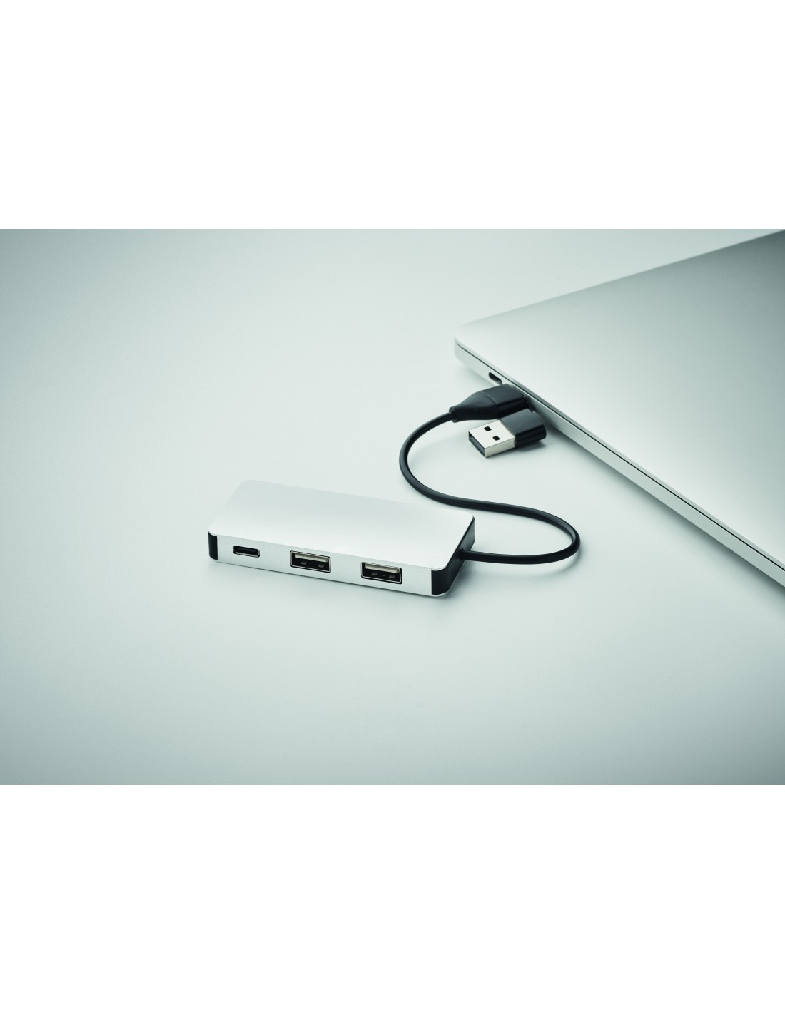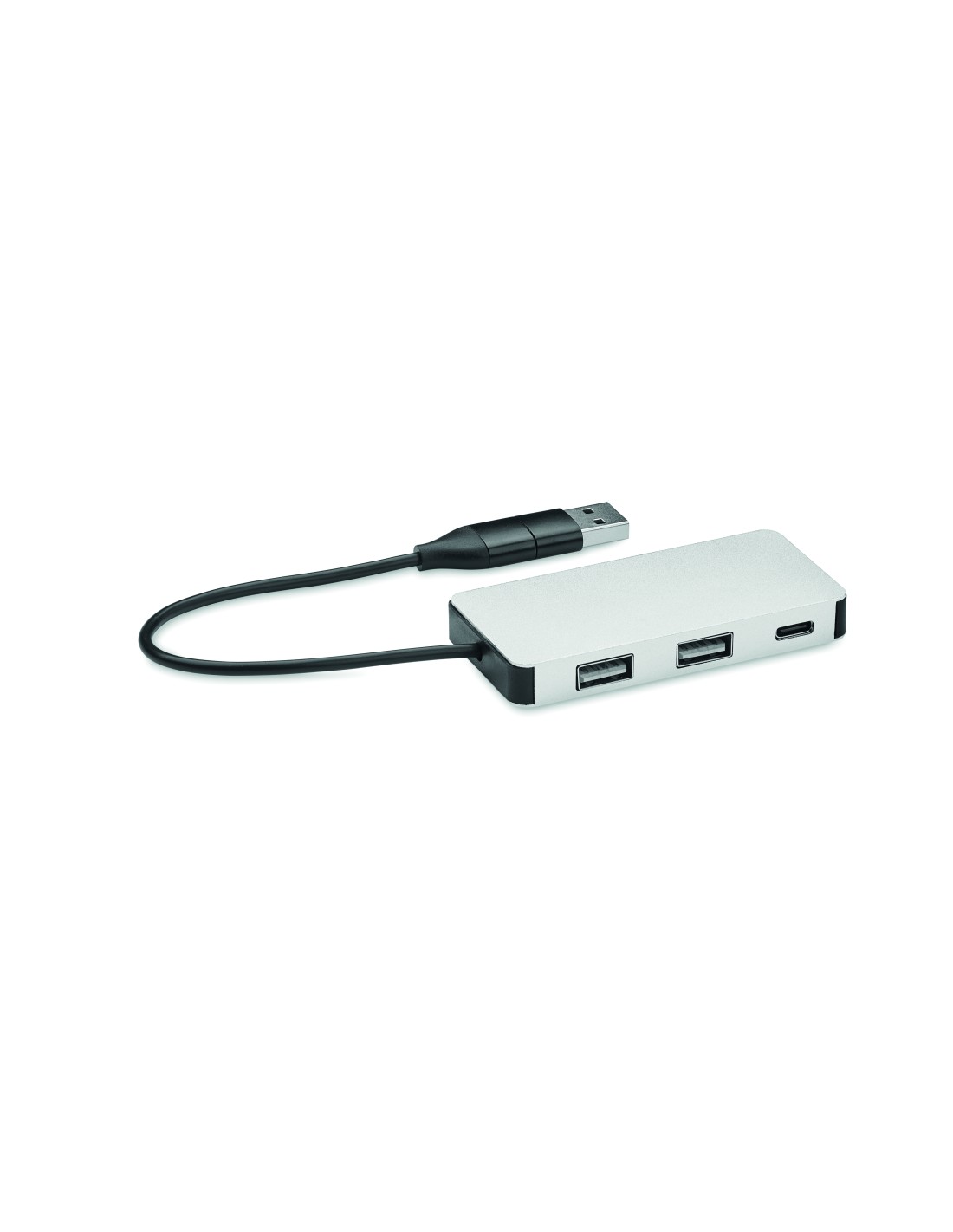 Hub USB 2.0 con connettore a doppio ingresso per il collegamento alla porta USB A o alla porta type C. L'hub stesso ha due output USB A e due output type C. Realizzato con ABS riciclato RCS, TPE riciclato e bambù certificato FSC. Contenuto riciclato totale: 32% in base al peso totale...