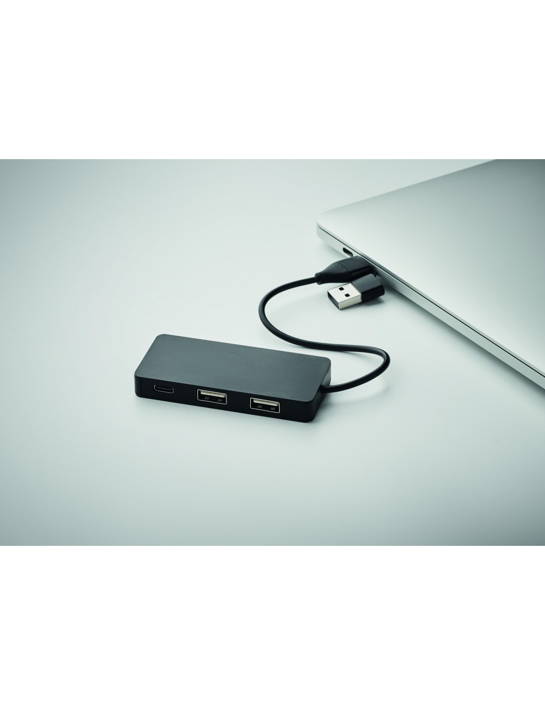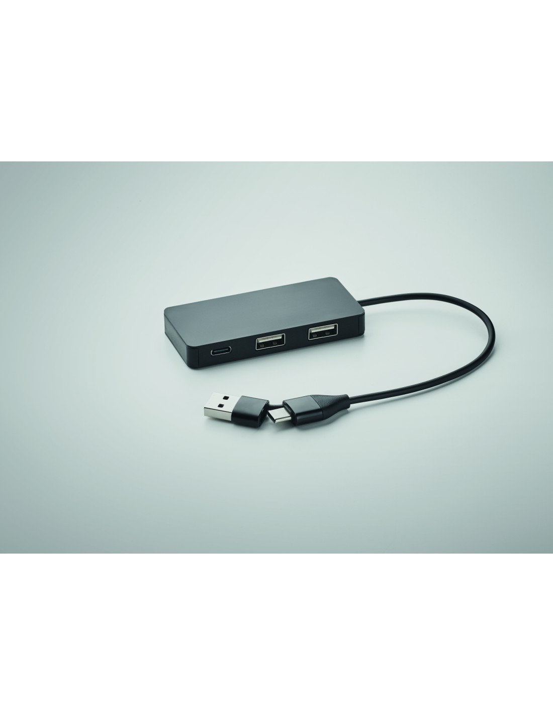 Hub USB 2.0 con connettore a doppio ingresso per il collegamento alla porta USB A o alla porta type C. L'hub stesso ha due output USB A e due output type C. Realizzato con ABS riciclato RCS, TPE riciclato e bambù certificato FSC. Contenuto riciclato totale: 32% in base al peso totale...
