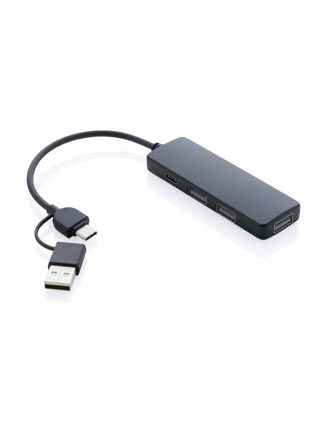 Hub USB realizzato al 100% in plastica ABS riciclata secondo gli standard RCS. RCS (Recycled Claim Standard) è uno standard per verificare il contenuto riciclato di un prodotto lungo l'intera filiera produttiva. Include 3 porte USB A 2.0, una porta type C e un cavo integrato da 8,5 cm in TPE riciclato al 100% certificato RCS. Contenuto riciclato totale: 50% in base al peso totale dell'articolo. Doppio connettore in input, quindi adatto sia ai computer type C che USB A. Articolo e accessori 100% senza PVC. Confezionato in scatola FSC mix.