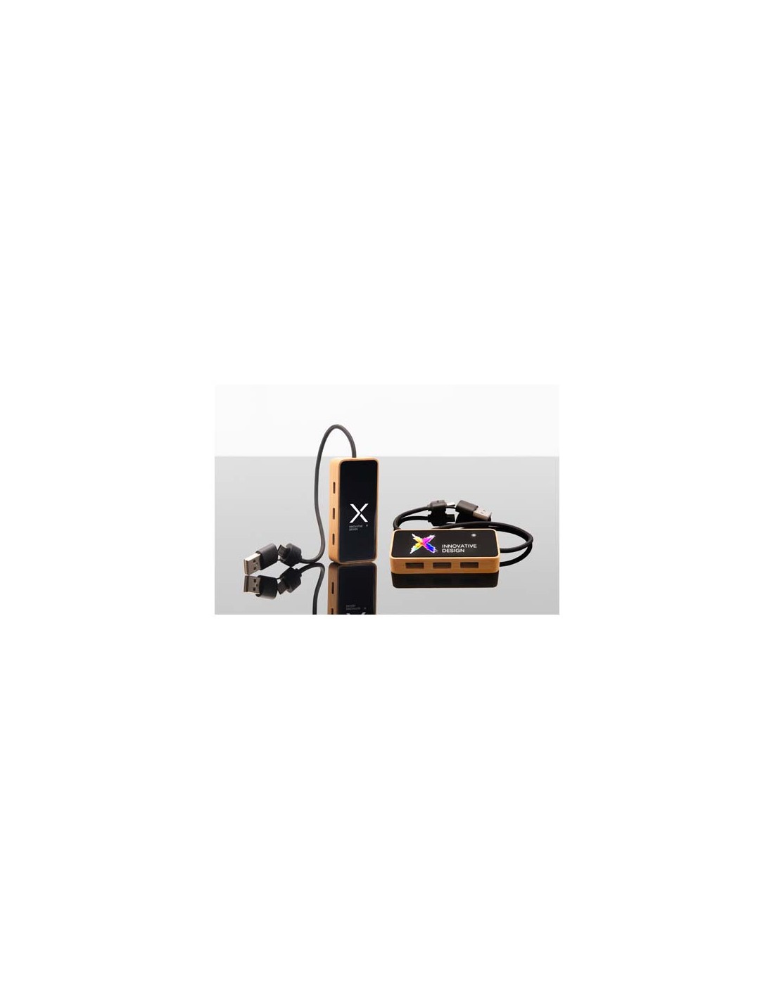 Hub USB 8 in 1 realizzato in bambù e PET riciclato provenienti da fonti responsabili, in grado di collegare fino a 6 dispositivi contemporaneamente con 3 porte USB-A e 3 porte di tipo C. Completamente compatibile con i computer moderni, è dotato di un logo LED personalizzabile e viene fornito in una confezione regalo in cartone riciclato, che unisce funzionalità e design. Velocità di trasferimento: USB/480 Mbps. Dimensione: 8 x 3,5 x 1,5 cm. Lunghezza del cavo: 24 cm.