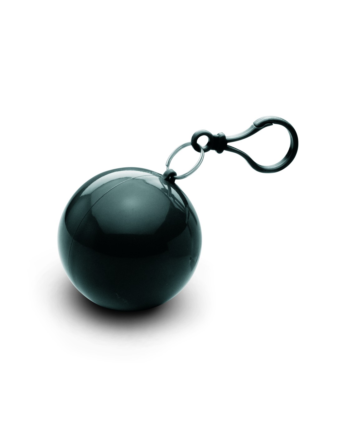 Poncho trasparente in PE contenuto in una confezione sferica di plastica AS con moschettone per essere attaccato alla cinta o a una borsa.