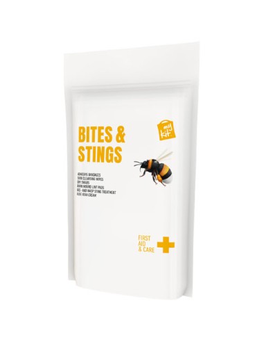 Il kit ideale per prevenire o curare le punture degli insetti in estate. Contenuto: 12 cerotti resistenti all'acqua, 4 salviettine disinfettanti, 2 garze sterili, 2 garze per ustioni, 1 cerotto per punture, 1 crema all'aloe vera. Tutti i prodotti contenuti nei MyKit rispettano le norme Europee vigenti. I prezzi includono stampa all-over fronte e retro. Fornito in una custodia di carta.