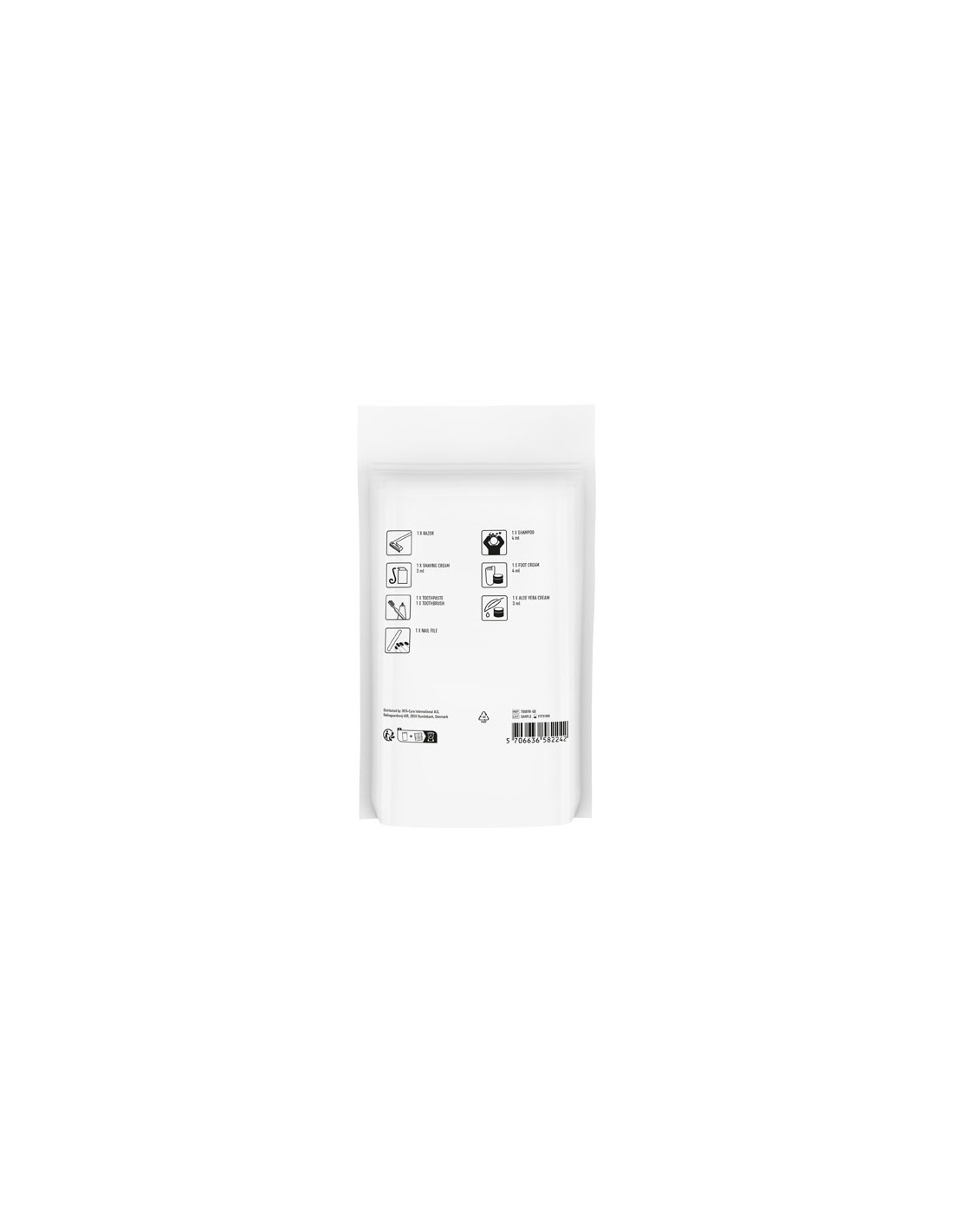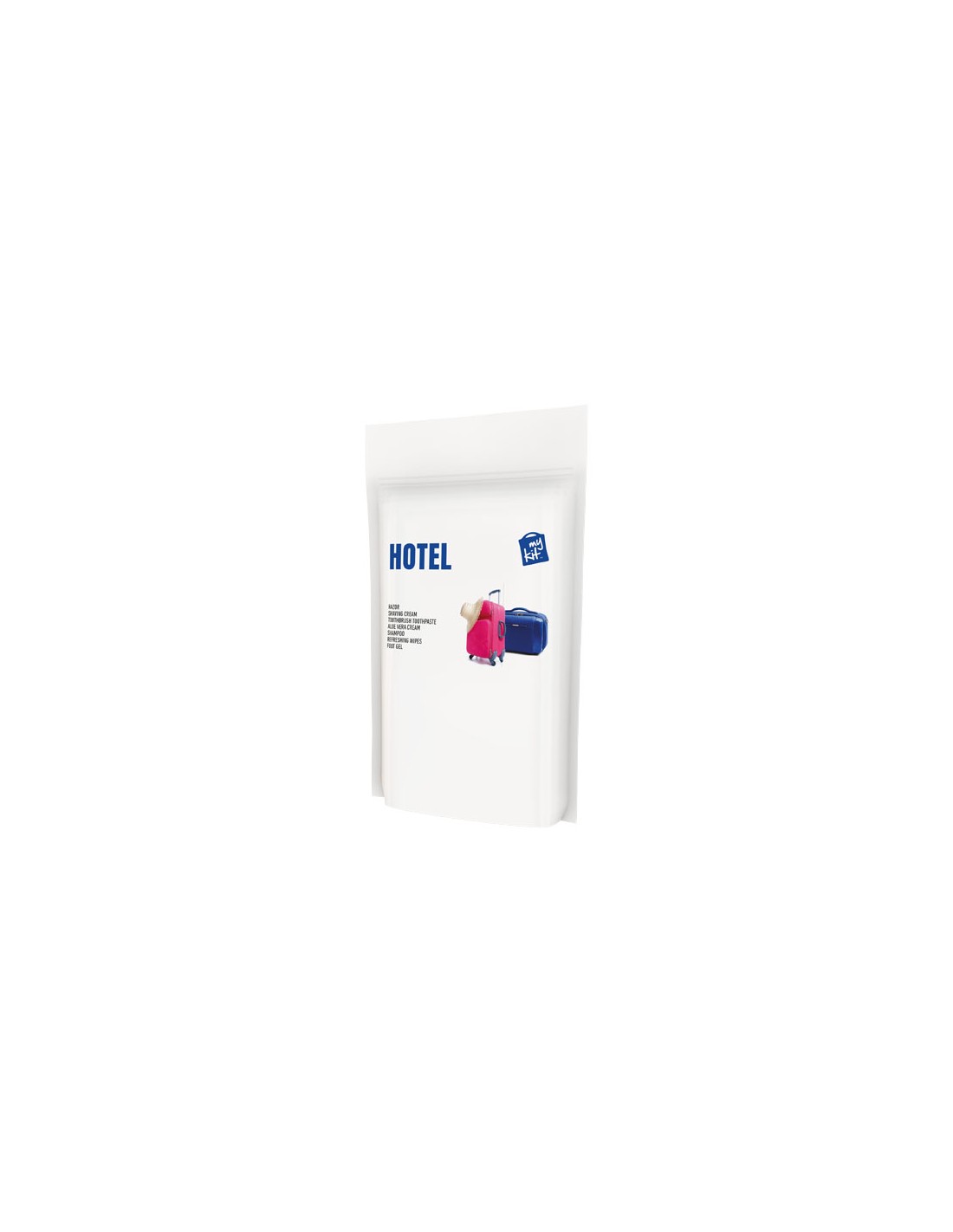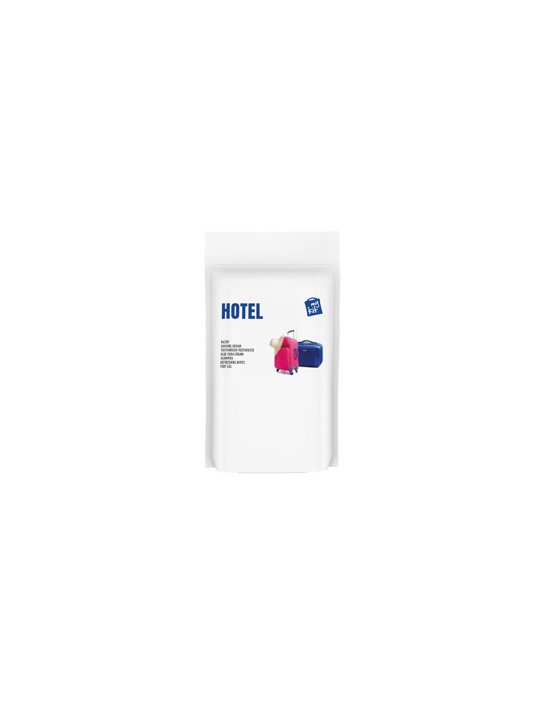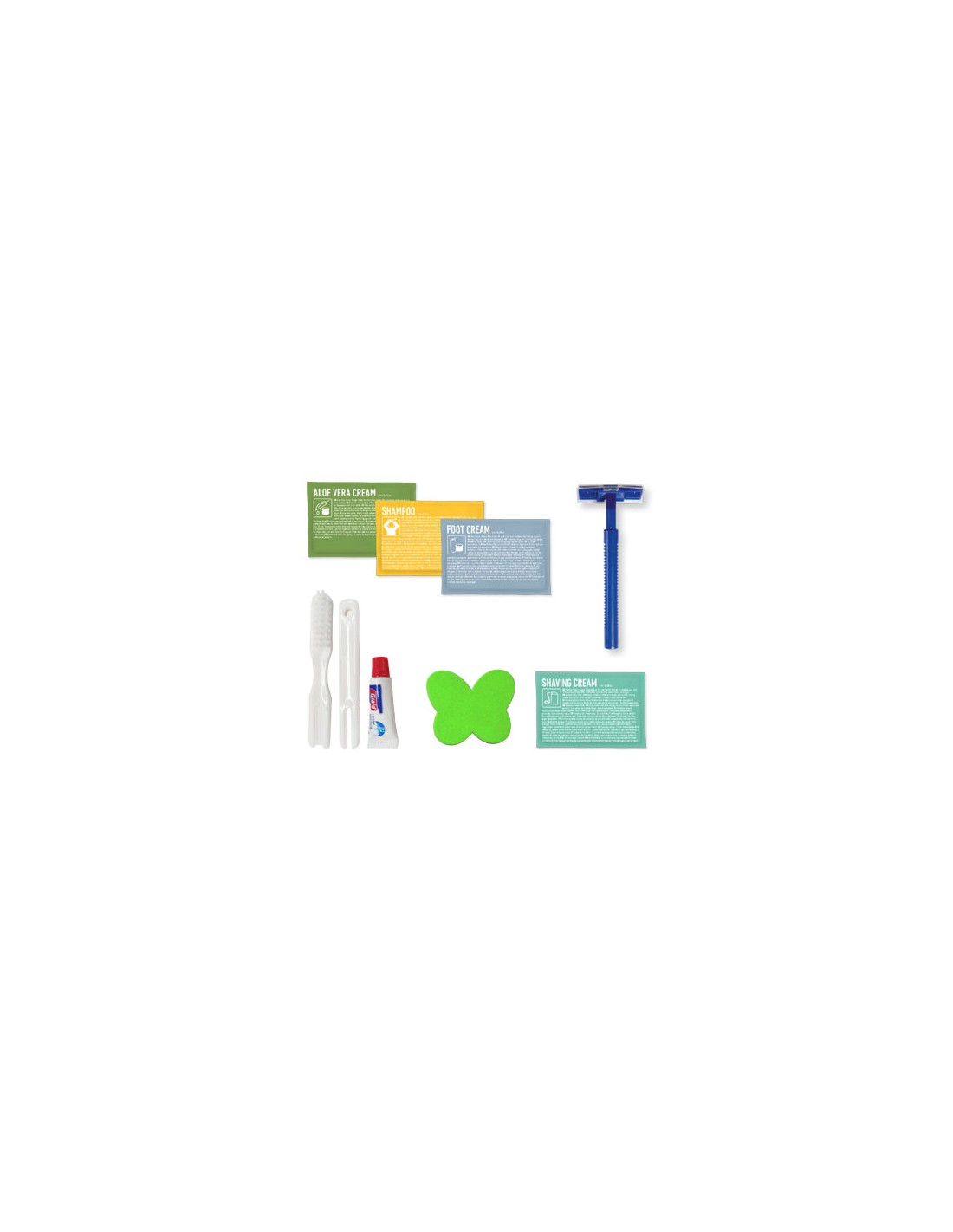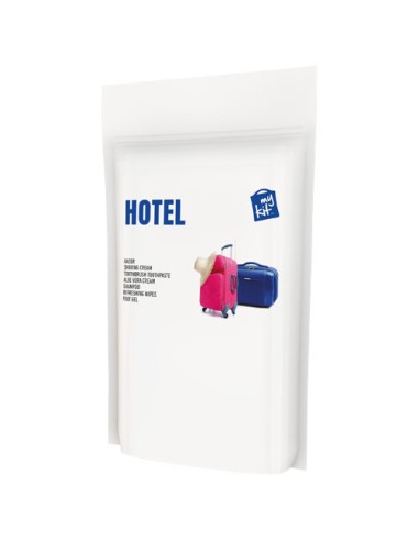 Kit di cortesia per hotel con tutto il necessario per gli spostamenti. Ideale per viaggi di lavoro, fiere o congressi. Contenuto: 1 rasoio, 1 gel da barba, 1 crema all'aloe vera, 1 shampoo, 1 gel per piedi, 1 lima per unghie, 1 spazzolino e 1 dentifricio. Tutti i prodotti del kit per il pronto soccorso e per la cura del corpo sono conformi a tutte le normative UE vigenti. Prezzo incluso della stampa a colori. Forniti in una confezione di carta.