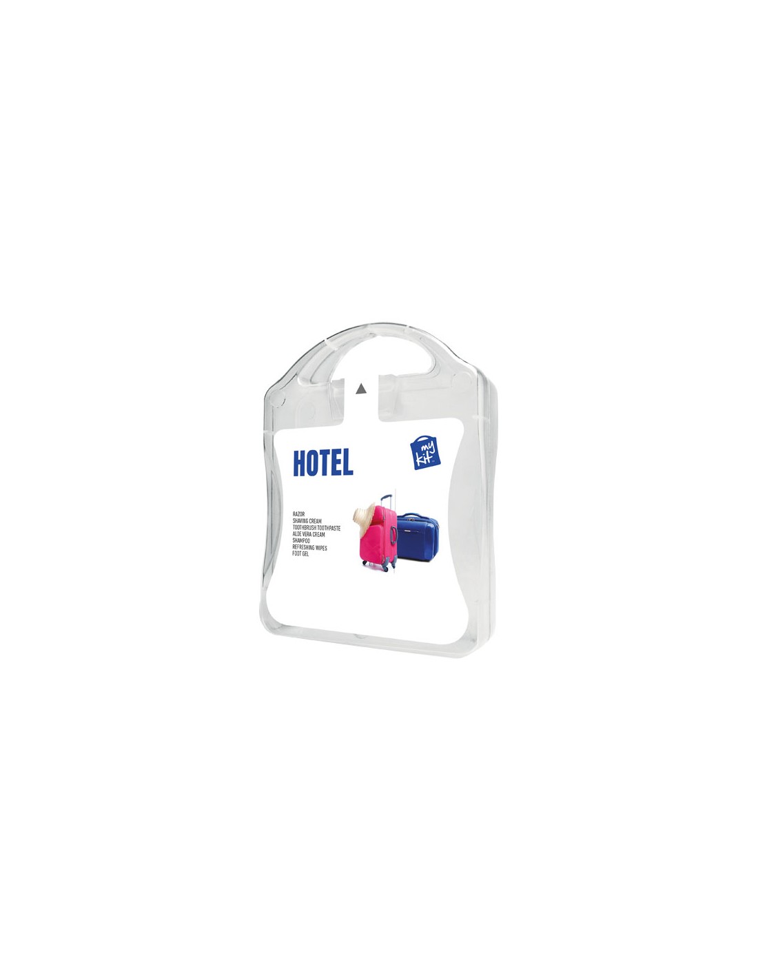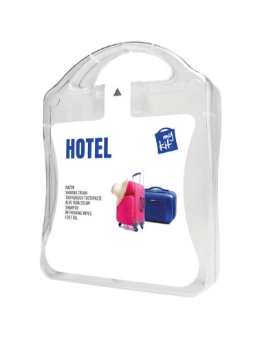 Il set di cortesia per hotel MyKit è ideale per i viaggi d'affari o per le lunghe giornate trascorse in fiera. Contenuto: 1 rasoio, 1 gel da barba, 1 crema all'aloe vera, 1 shampoo, 1 gel per piedi, 1 lima per unghie, 1 spazzolino e 1 dentifricio. Tutti i prodotti del kit per il pronto soccorso e per la cura del corpo sono conformi a tutte le normative UE vigenti. Prezzo incluso della stampa a colori.