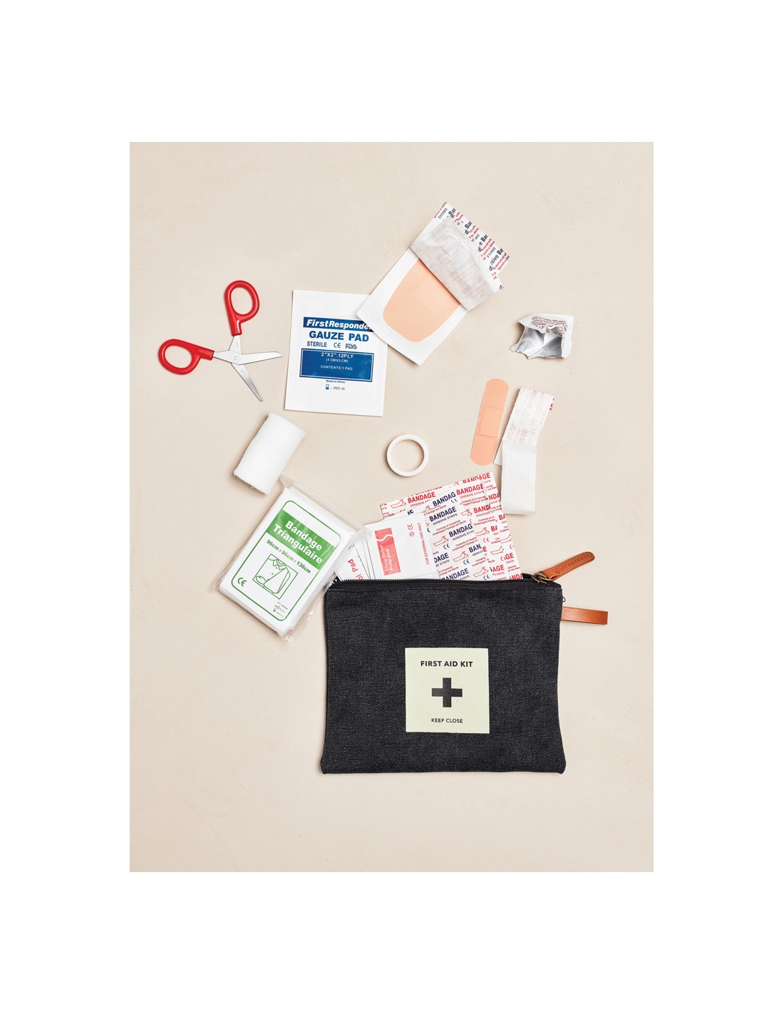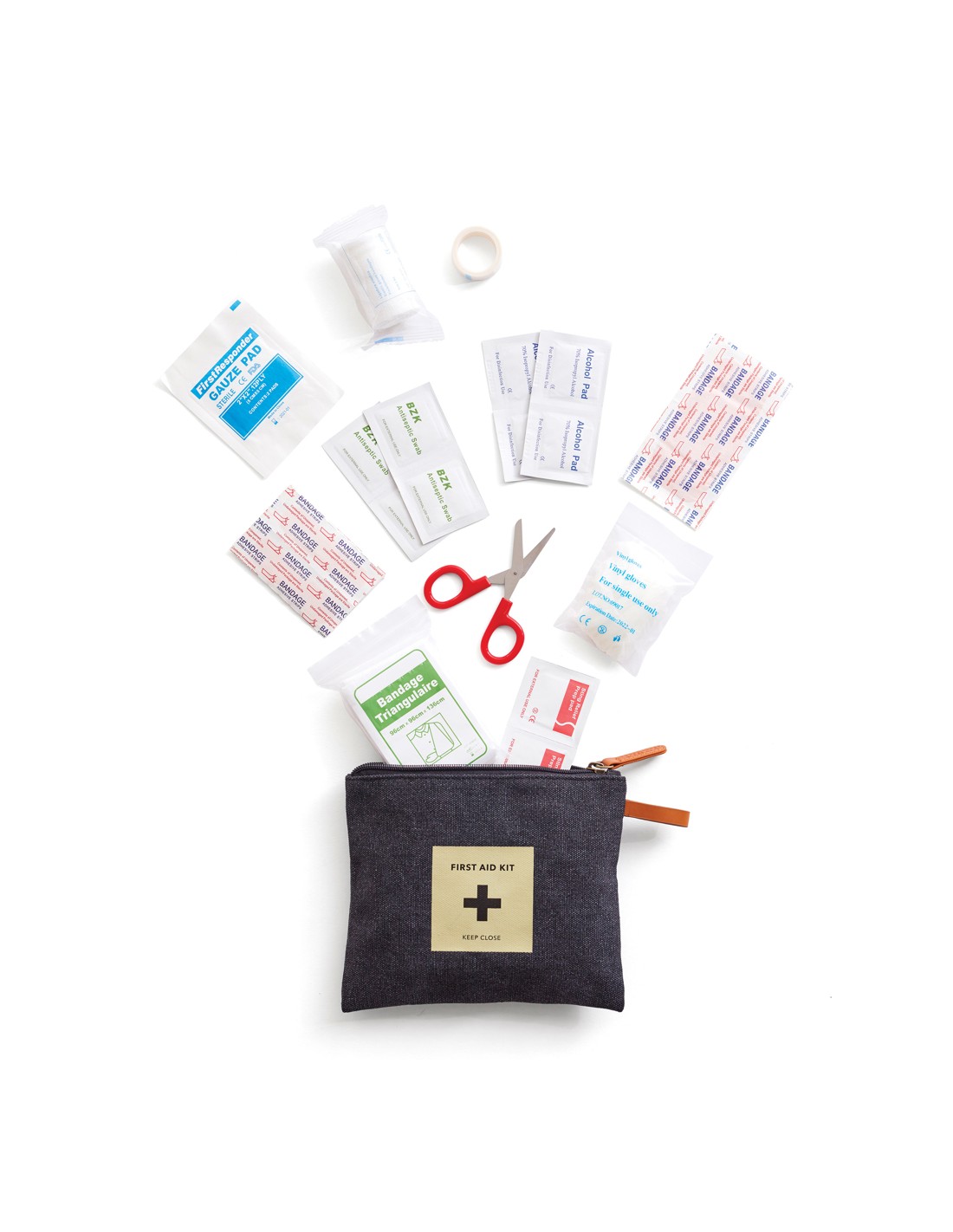 Un kit di pronto soccorso della nostra popolare serie Asado. Custodia in tessuto con cerniera contiene tutto il necessario in caso di piccoli incidenti come cerotti, forbici, bende, ecc. Confezionato in una busta di plastica.