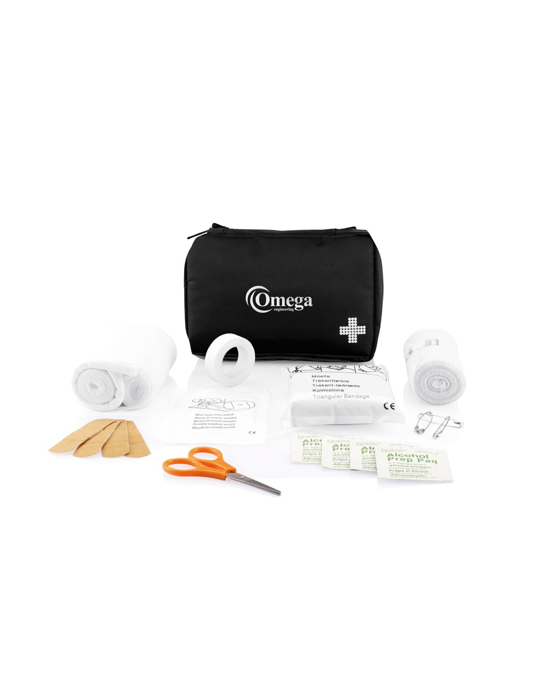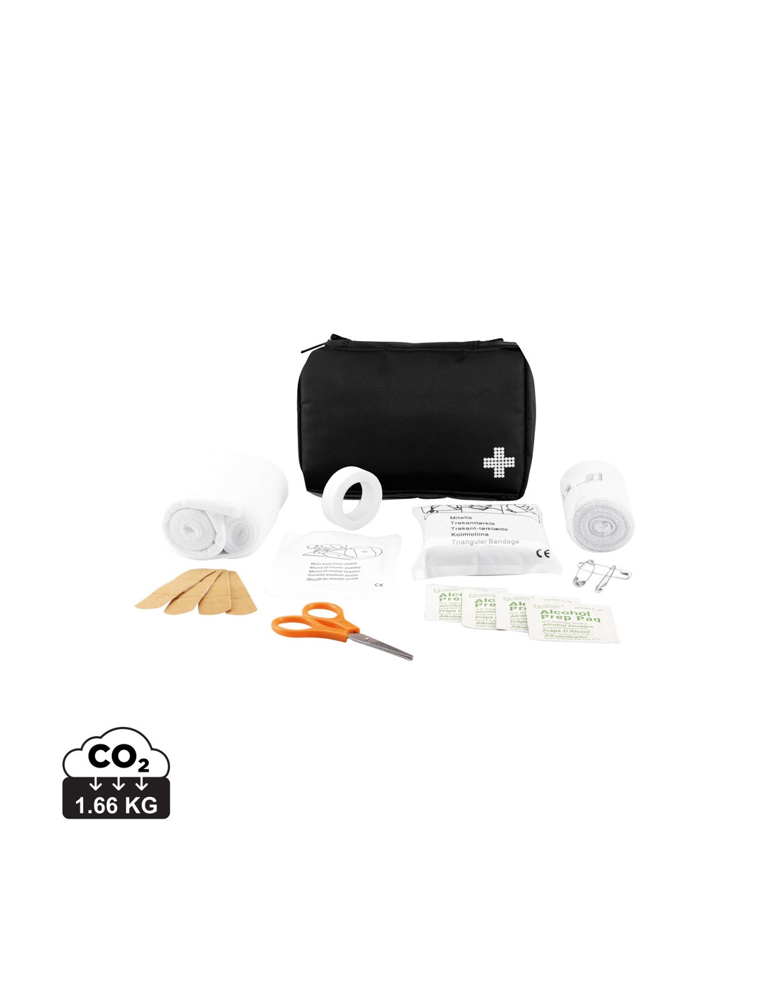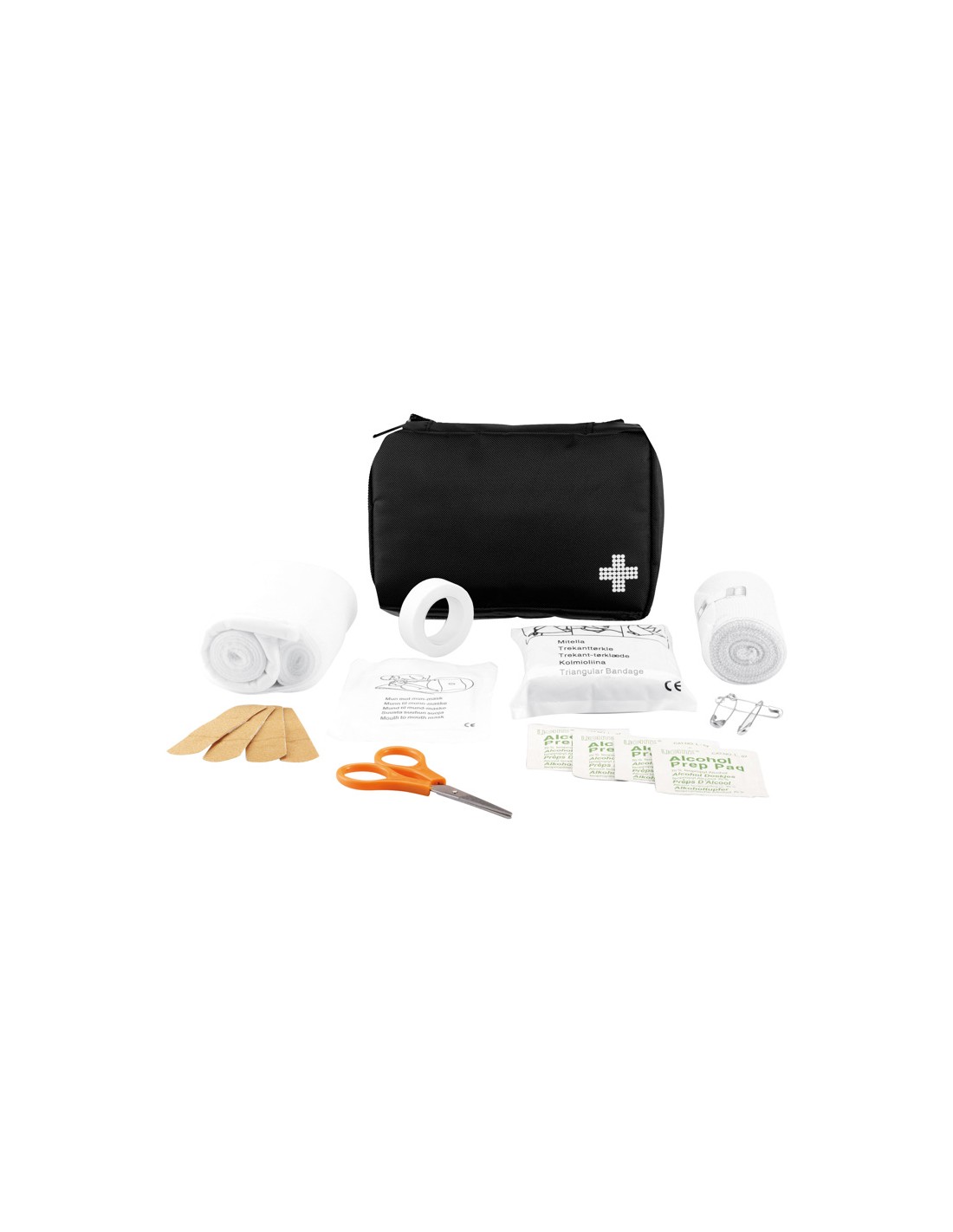 24 pezzi: benda, guanti sterili, un paio di forbici e nastro adesivo in astuccio di nylon. Il contenuto è piatto, quindi il set completo puo’ essere spedito , 200gr, conforme a normativa EN 13485:2016.