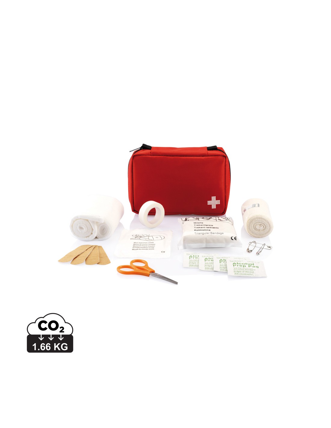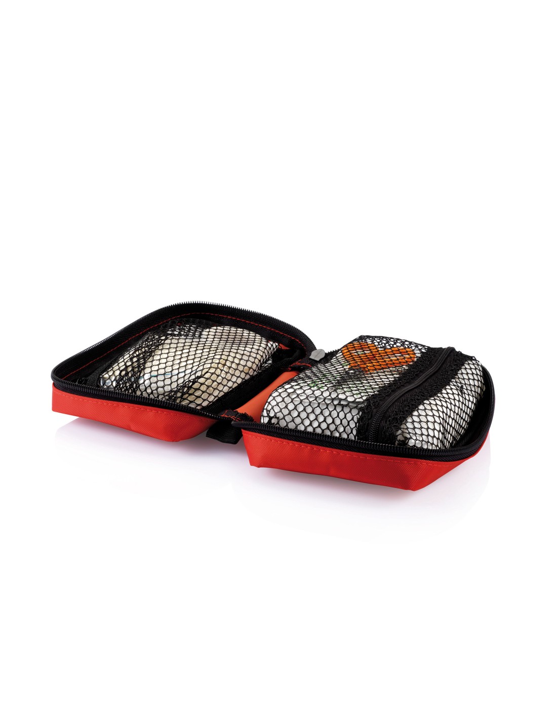24 pezzi: benda, guanti sterili, un paio di forbici e nastro adesivo in astuccio di nylon. Il contenuto è piatto, quindi il set completo puo’ essere spedito , 200gr, conforme a normativa EN 13485:2016.