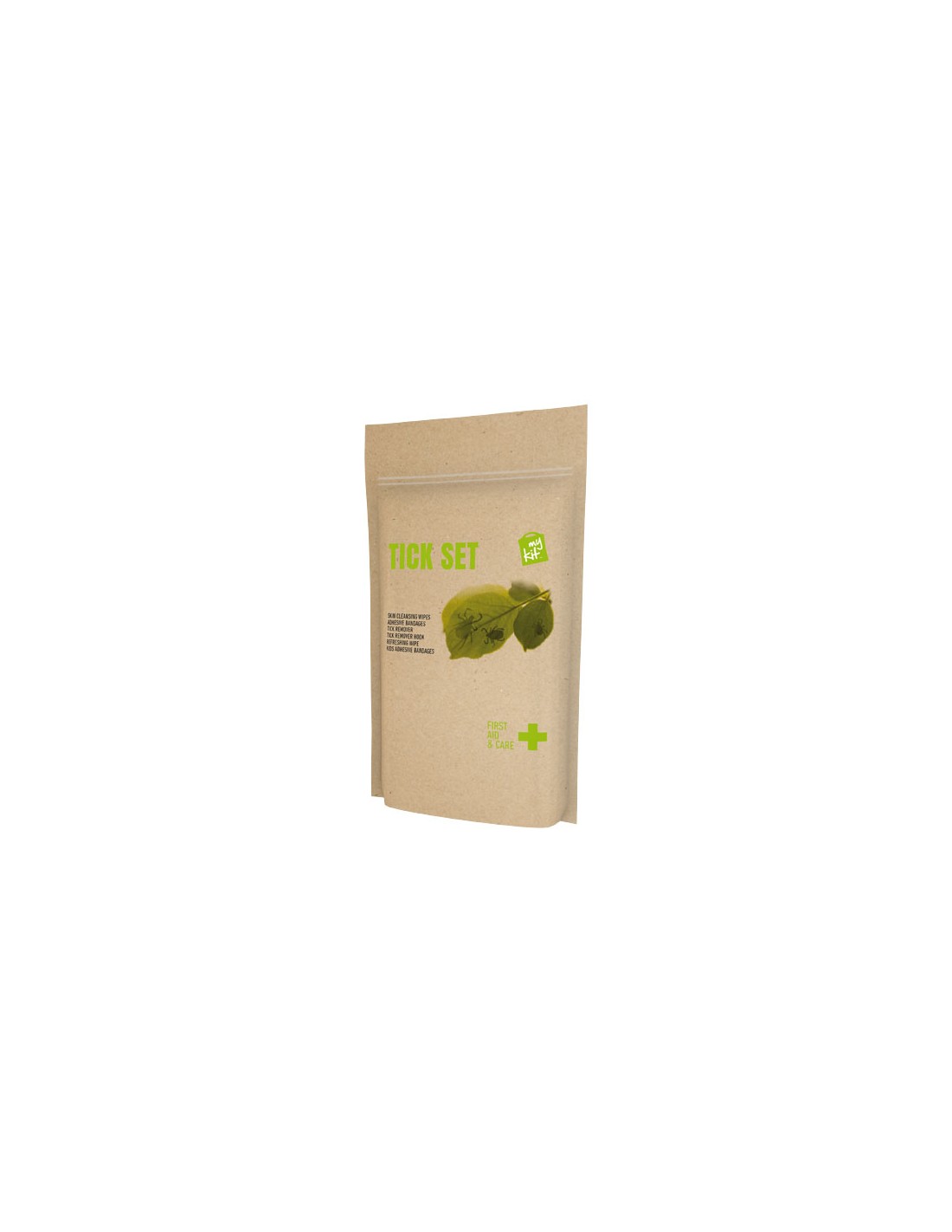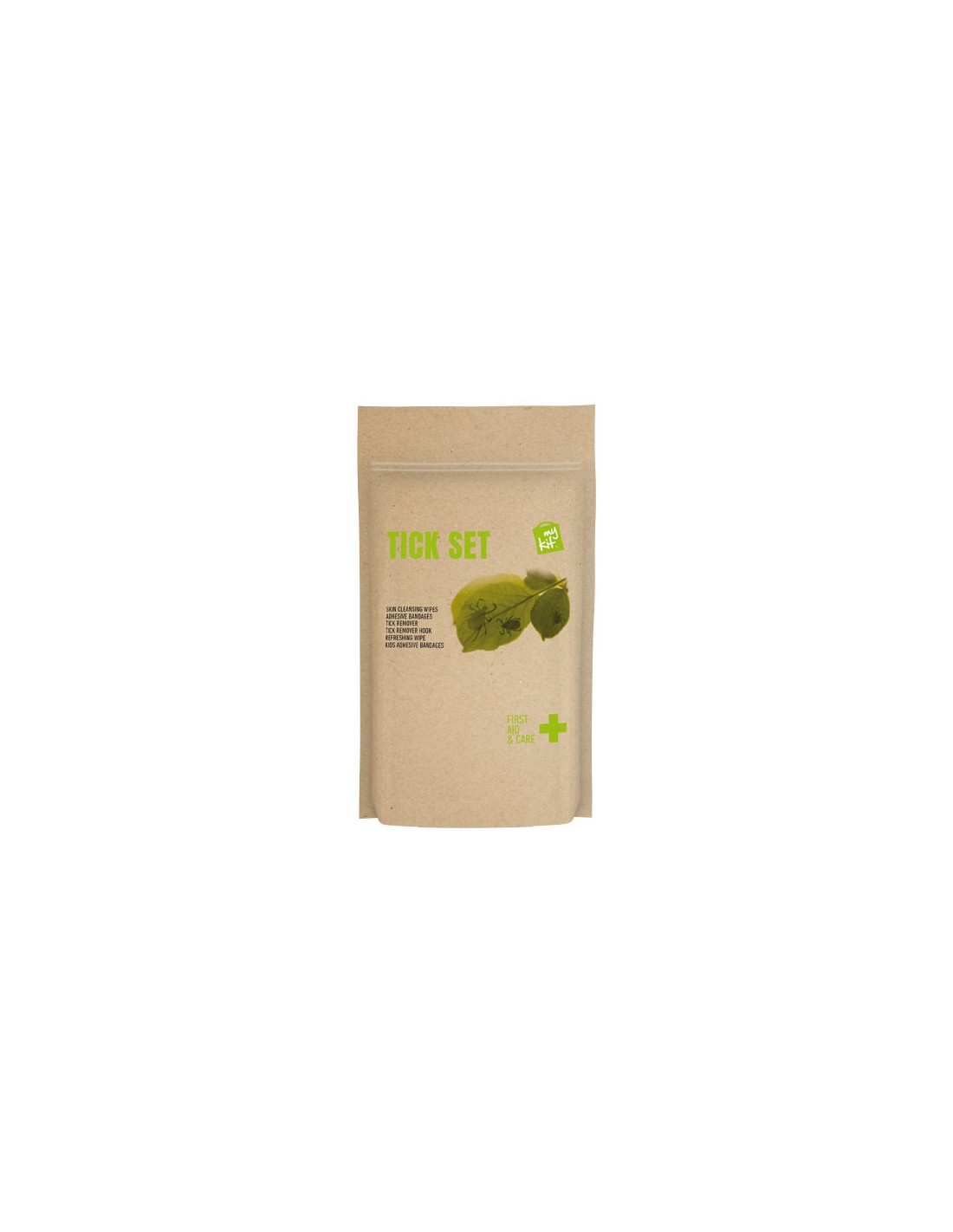 Il kit ideale per rimuovere le zecche e trattare i loro morsi. Contenuto: 4 cerotti resistenti all'acqua, 4 salviettine disinfettanti, 1 pinzetta per zecche blu (per umani), 1 uncino per rimozione zecche (arancione), 4 cerotti per bambini, 1 salviettina rinfrescante. Tutti i prodotti contenuti nei MyKit rispettano le norme Europee vigenti. I prezzi includono stampa all-over fronte e retro. Fornito in una custodia di carta.