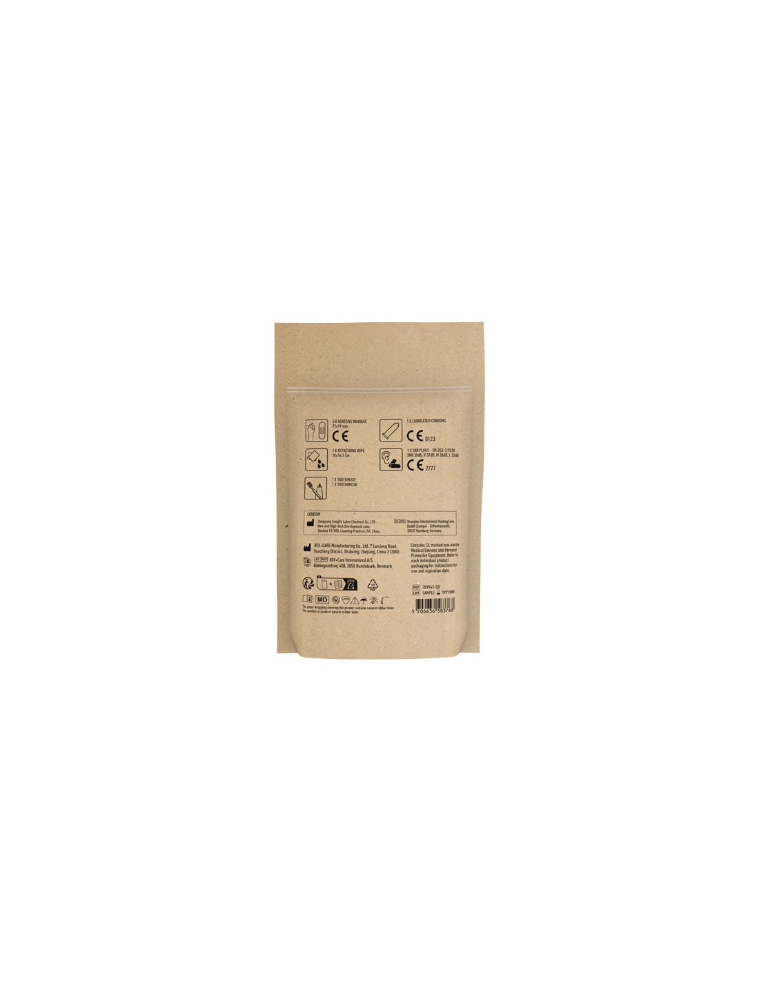La custodia ha una tasca frontale, uno scomparto principale con zip nera, una cintura nel retro. Contiene: fasciatura triangolo, benda PBT, salviettine disinfettanti, cerotti, forbici, spilla e nastro. E’ conforme alla normativa EN 13485:2003.