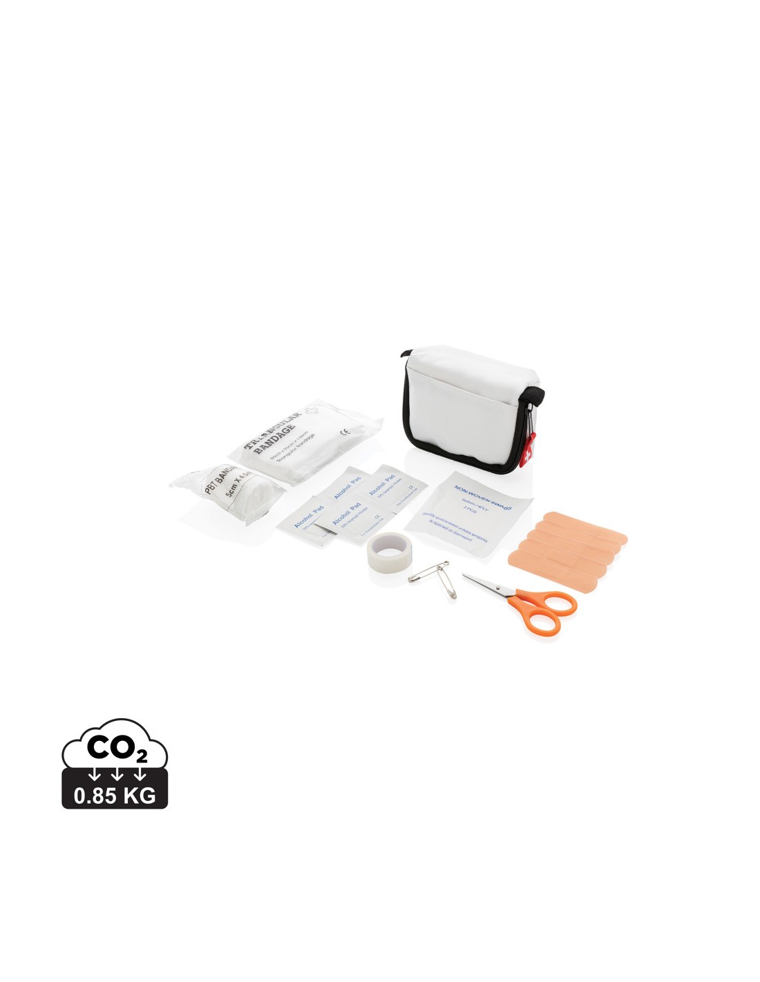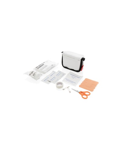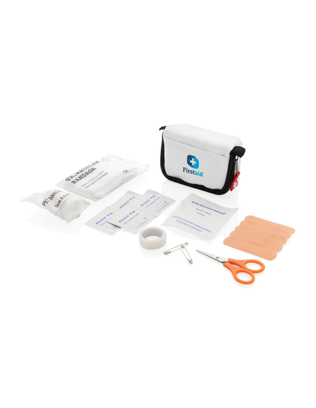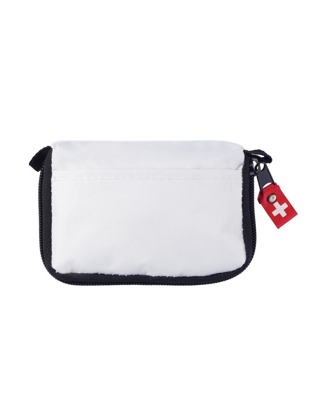 La custodia ha una tasca frontale, uno scomparto principale con zip nera, una cintura nel retro. Contiene: fasciatura triangolo, benda PBT, salviettine disinfettanti, cerotti, forbici, spilla e nastro. E’ conforme alla normativa EN 13485:2003.
