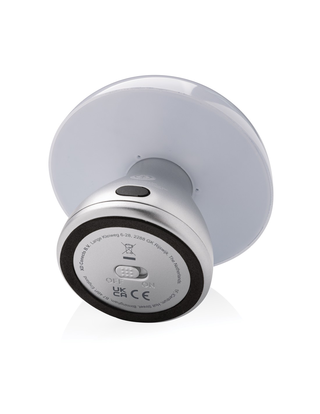 Lampada da tavolo portatile e ricaricabile dal design alla moda, che farà bella mostra di sé sia sulla scrivania che in salotto. Realizzata con ABS e alluminio riciclati certificati RCS. Contenuto riciclato totale: 84% in base al peso totale dell'articolo. La certificazione RCS garantisce una catena di approvvigionamento dei materiali riciclati completamente certificata. La lampada da tavolo può funzionare per 18 ore con una singola carica e può essere ricaricata in 2 ore. Con due modalità (luce calda e luce bianca) Ricaricabile tramite USB-C. Confezionata in un imballaggio FSC® mix. Impermeabile IPX 4.